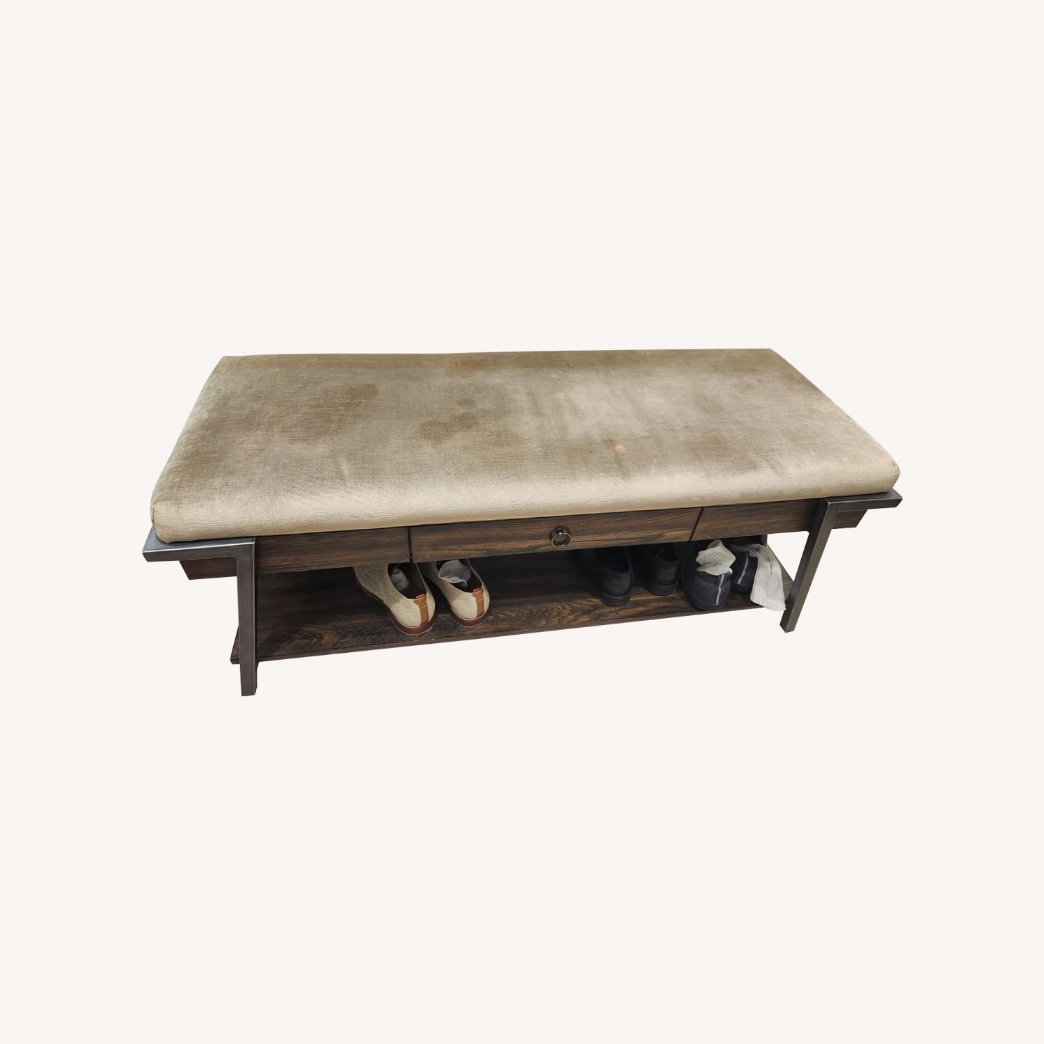 Seller's Notes:Has a small stain in the upholstery. Some drawers for extra storage. Perfect to sit and put your shoes on by the entrance.