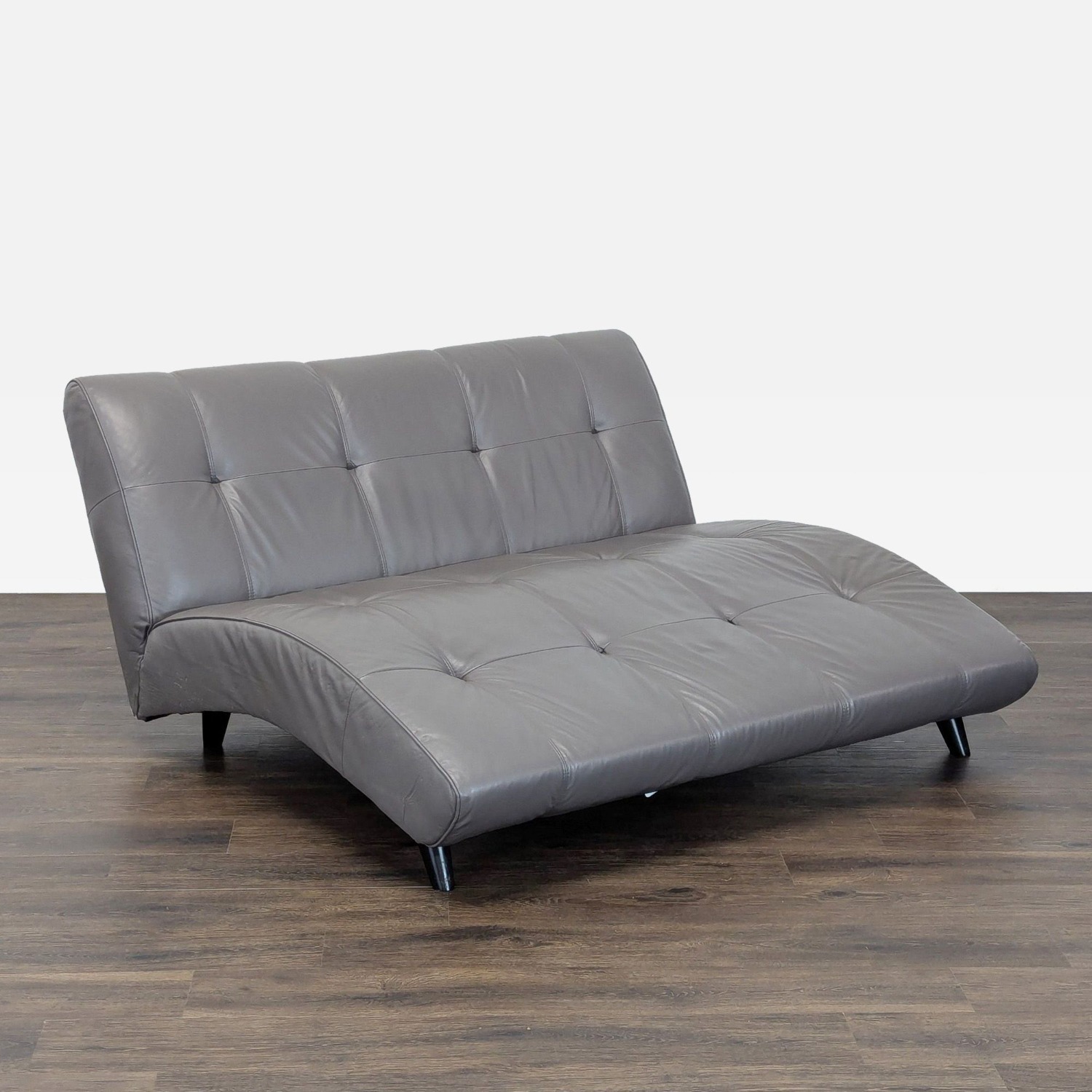 Seller's Notes:Modern EQ3 armless leather lounge sofa featuring a sculpted curved seat and fixed back design. Upholstered in genuine gray leather with tufted detailing and sleek legs.