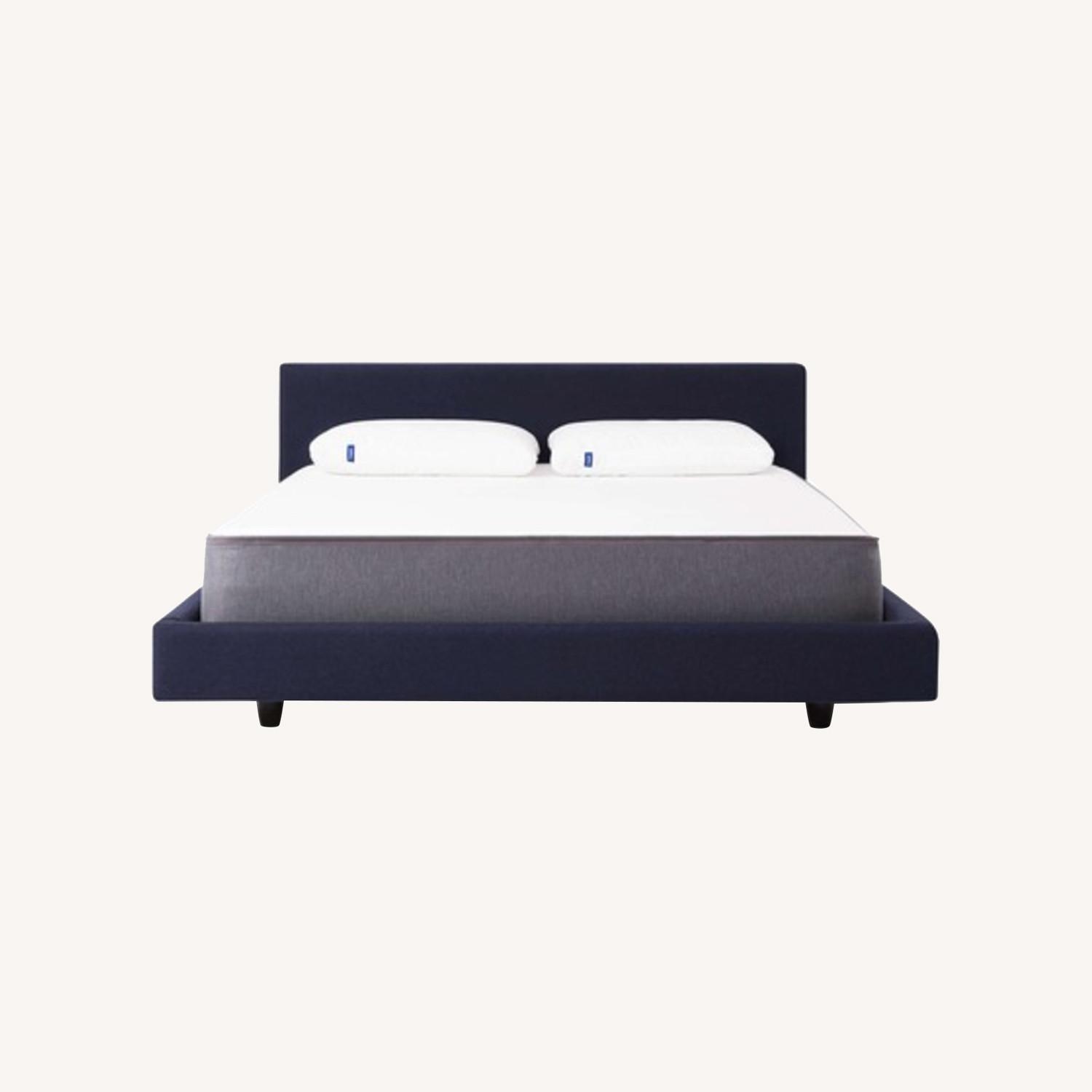 Seller's Notes:The Bento upholstered bed features low, modern proportions with a comfortable headboard. Inset legs give the bed a floating appearance. Custom Lana Deep Blue Fabric (Grade 60) Custom Made in Canada Bed slats are imported (Original EQ3 METAL slats INCLUDED) Black Inset legs give the bed a floating appearance (Leg size is 6.8" for great clearance under the bed for storage) Queen: 65"w x 90"d x 29"h (with 6.8 Leg Height - 31.8") Construction/Frame: EQ3 frames and interior construction are warranted for life (25) years.