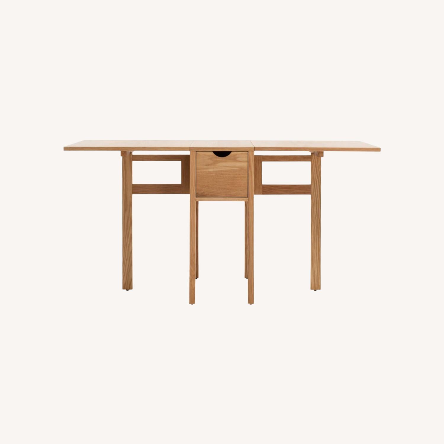 Seller's Notes:We bought this EQ3 Hallie Folding Table three years ago for $999. It’s a clean, minimal design that’s also highly functional. Both sides fold down, so it can be tucked away against a wall or used as a console. Fully extended, it comfortably seats four, or even six.