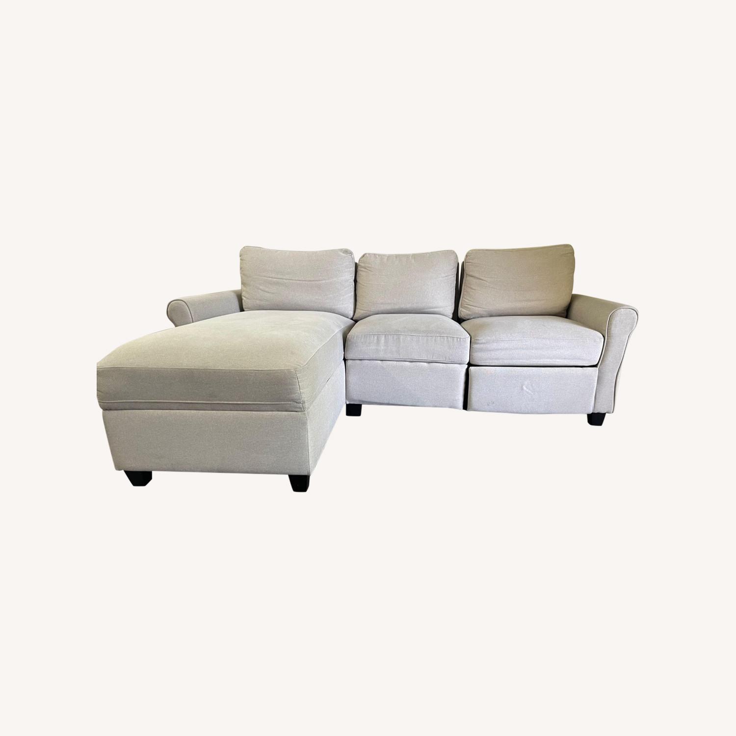 Seller's Notes:Selling 1 year old Serta Reclining Sectional Sofa with Left Chaise, Built-In Storage, Low-Maintenance imported Fabric, Color: Beige No damage, easy maintenance, and gently used Is in a home with no small children or pet