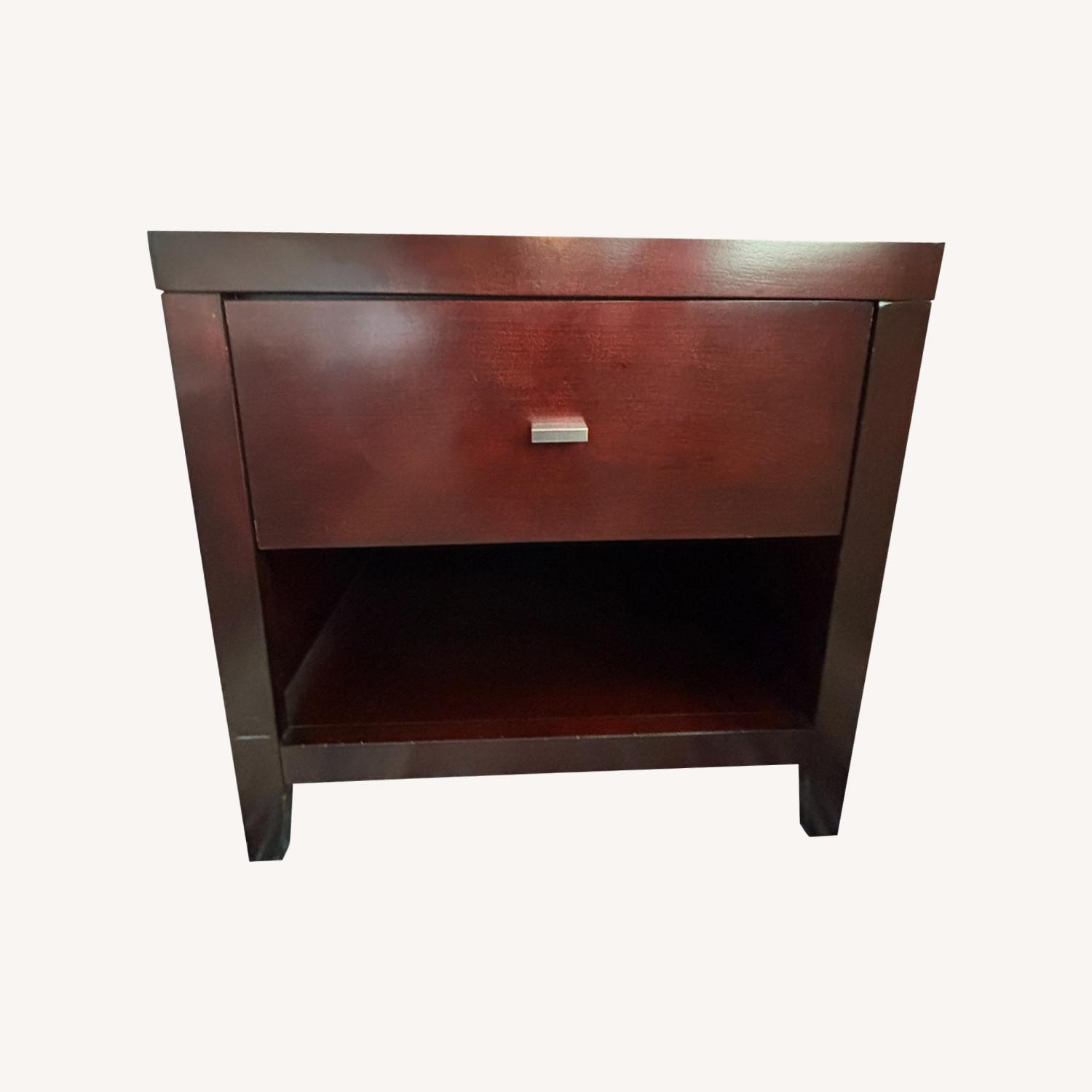 Seller's Notes:Solid wood and very sturdy furniture in good condition with only minor scratches after many years of use. The espresso brown wood is a beautiful rich color with brushed nickel pulls for a nice contrast. The nightstands each have one drawer and a bottom shelf for additional organization and decorating.