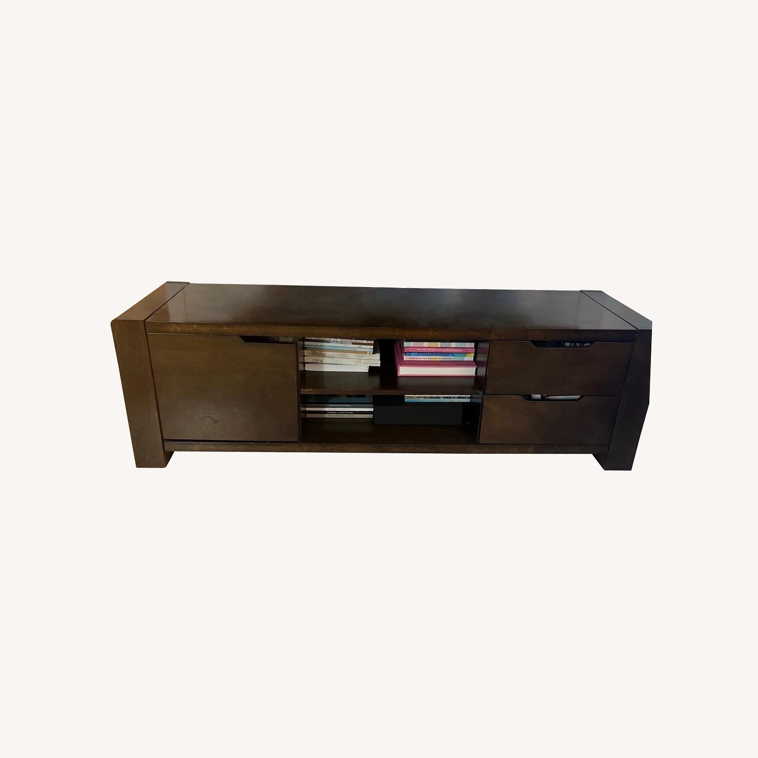 Seller's Notes:Espresso Wood TV Stand includes two drawers and a large cupboard for storage along with two shelves. Purchased in 2019 and in perfect condition! Supports TVs up to 65" Height 18.5 inches Width 59.1 inches Depth 18.1 inches