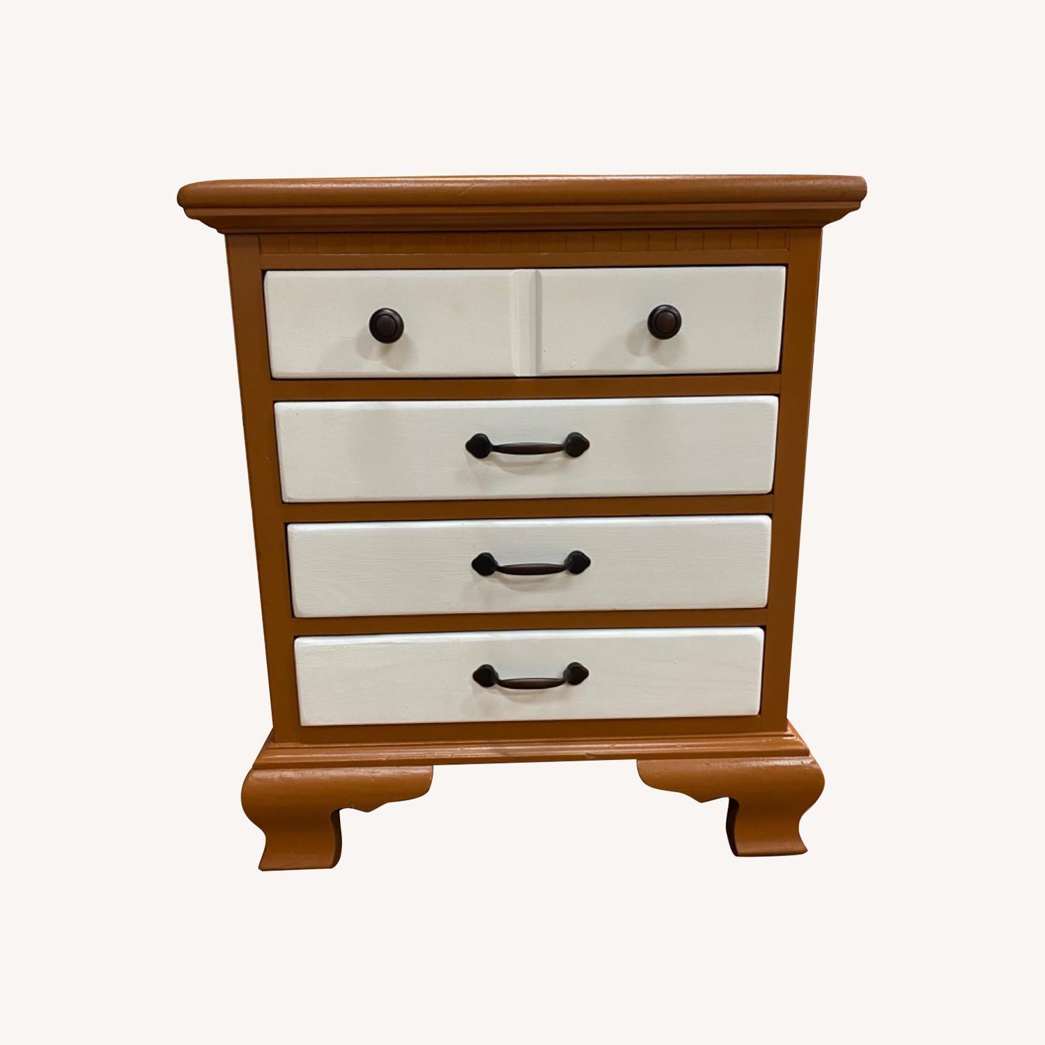 Seller's Notes:This is an Ethan Allen nightstand from 1984! Has been completely refinished. Warm Caramel base, white drawers inside and out, and brand new brass colored knobs/handles. This piece is 38 years old so it has some wear I just couldn’t fix, little knicks or scratches but it’s amazing compared to what it used to look like (see last picture)!