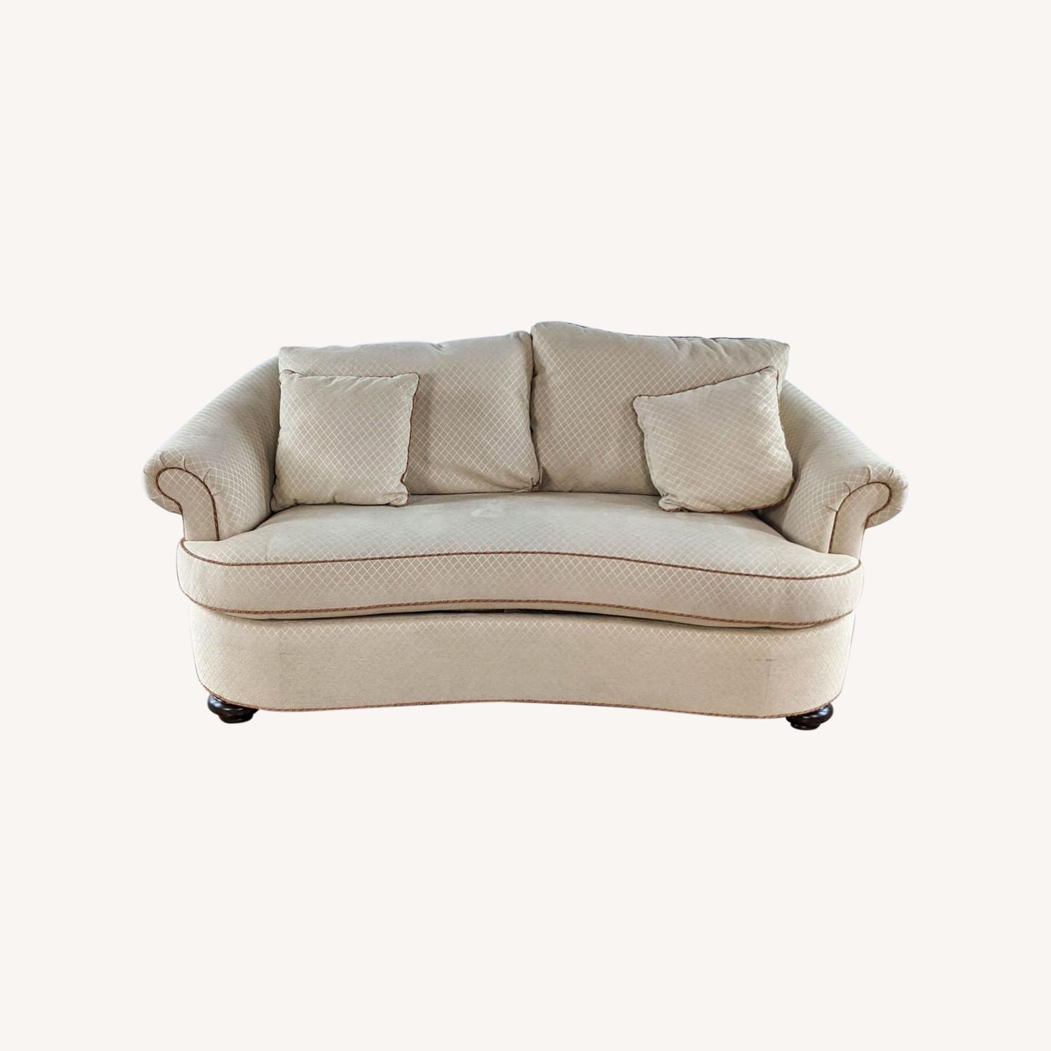 Seller's Notes:High-End Brand Diamond Pattern Chenille Fabric Upholstered Loveseat With Accent Piping Features Sloped Arms And Wood Bun Feet. Brand: Ethan Allen. Model: . #SKU: 1052345