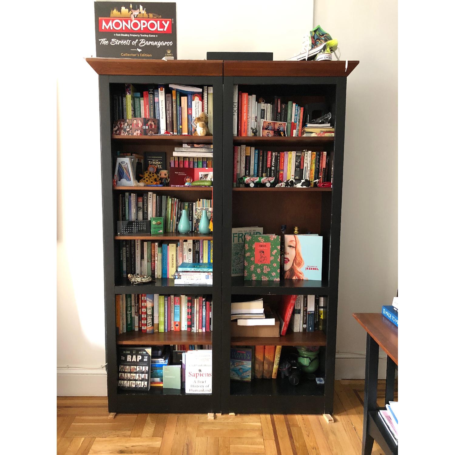 Seller's Notes:These 2 Ethan Allen bookcases have served me very well but I am moving and will no longer be able to fit them in my new space! They're mainly black with dark brown shelves and dark brown accents on the top. Beautiful and classic and will always be in style. They have minor scratches but are not noticeable unless you are close to them. One of them is missing a shelf but it actually looks cute for decorating with pretty vases or pretty larger books.
