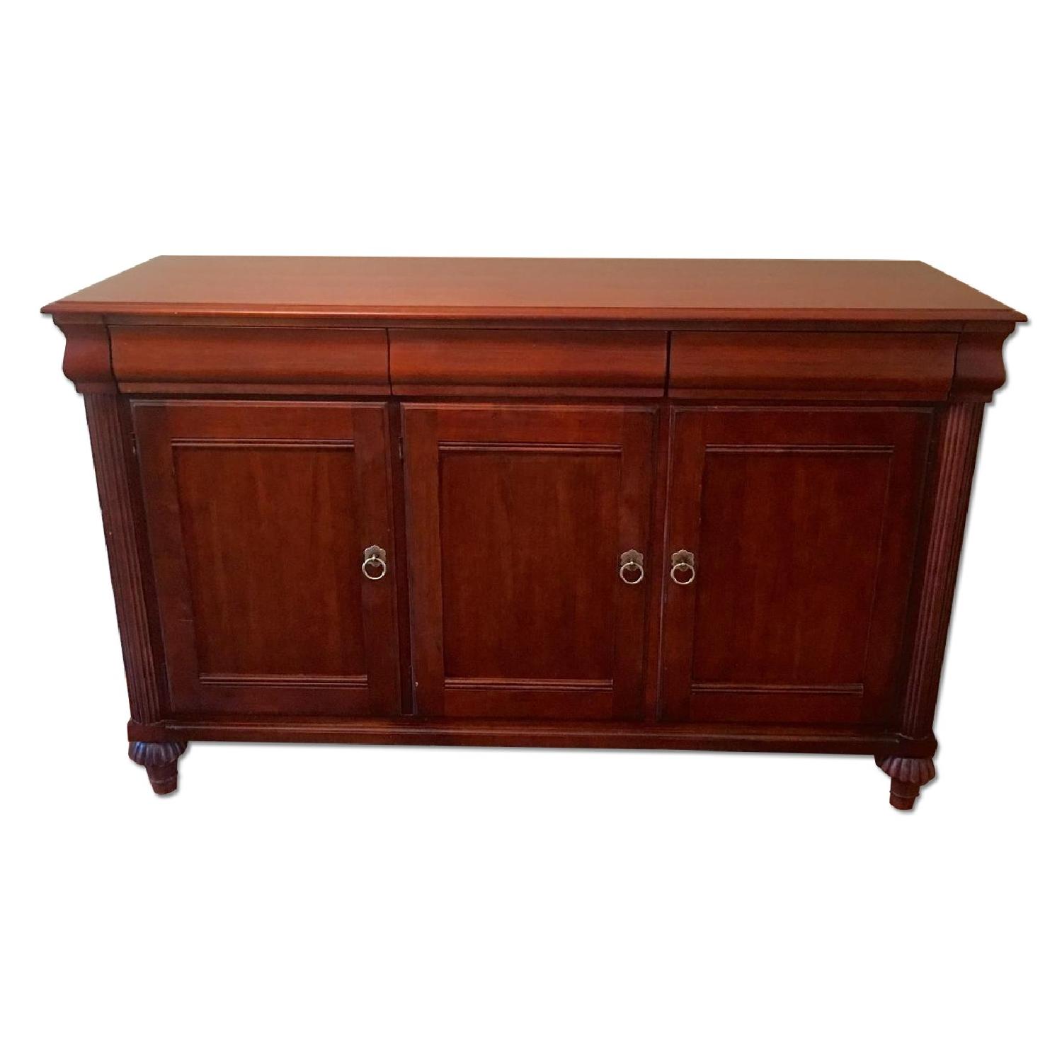 Seller's Notes:This buffet is a substantial piece of furniture that offers great storage, including silverware insert in one drawer. We enjoyed this as part of our dining room set for over 10 years. Shows signs of normal wear and tear. Please see photos for detail. British Classic collection has an aging process where the furniture maker burns the surface to created little holes that look like burned to give it an old vintage aged look. If you see little holes on the table that looks burned, with darken interior, that's part of the design; scratches on the table will not have that burned look. Reason for selling: Moving