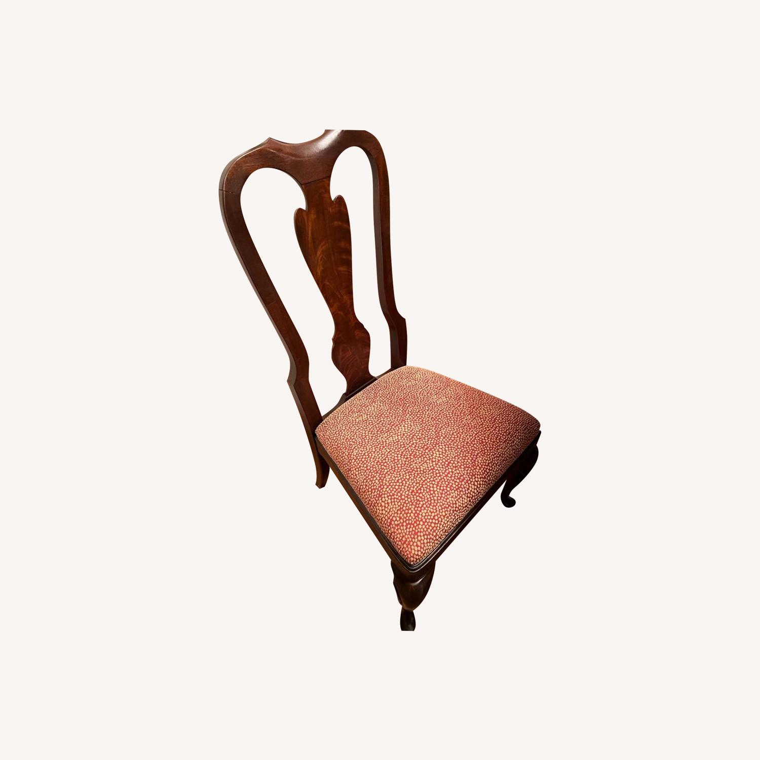 Seller's Notes:Dark hardwood construction with a traditional fiddleback design, curved top rail, and a prominent sculpted back splat. Featuring an upholstered rust-colored seat with a speckled pattern, cabriole legs with claw-foot details. Two out of the six chairs have curved armrests.