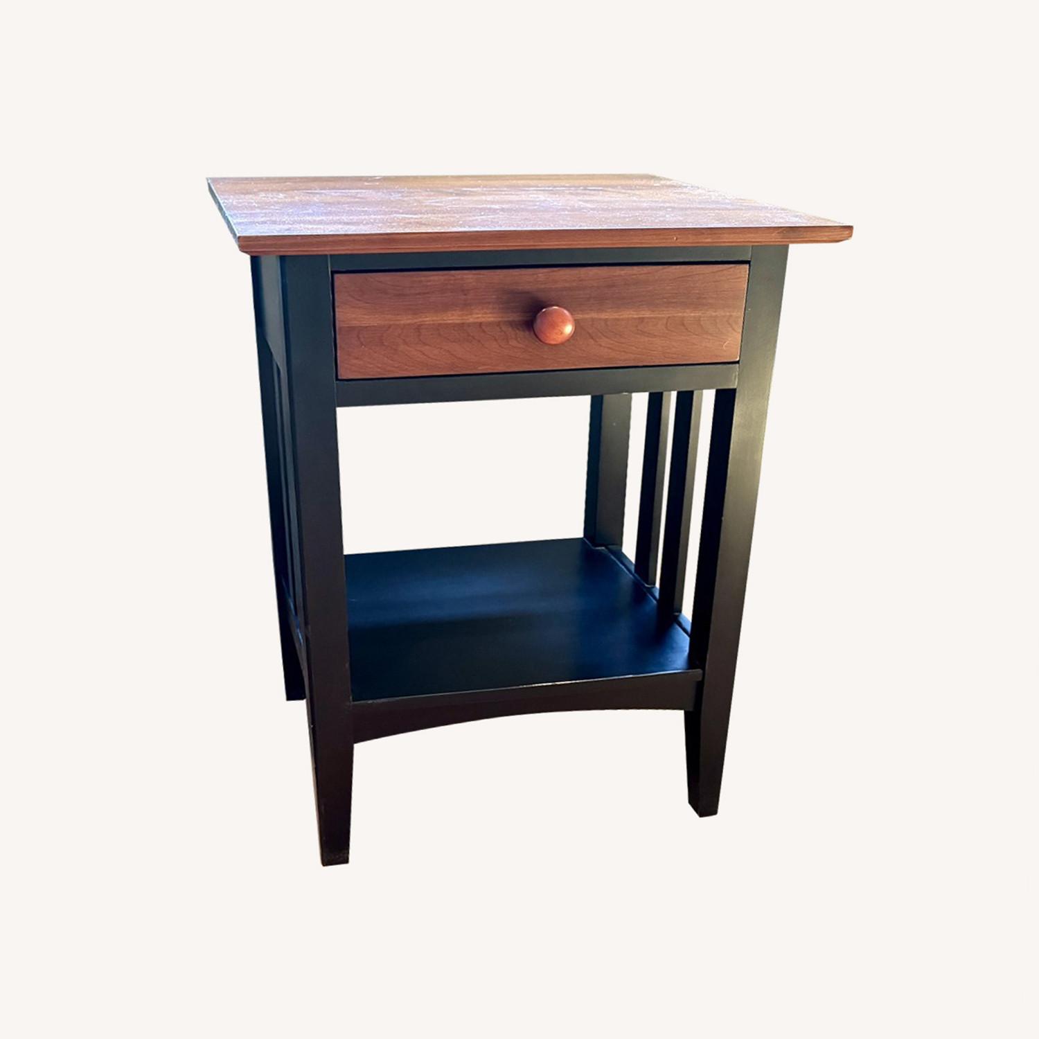 Seller's Notes:We're reluctantly offering our pristine and stylish Ethan Allen Cherry Wood Nightstands set. Crafted with Ethan Allen's signature quality, this exquisite pair of nightstands boasts a luxurious cherry wood finish that effortlessly enhances various bedroom aesthetics. Ethan Allen Cherry Wood Nightstands (Set of 2) – • Dimensions: 21" W x 17" D x 28.5" H • Each nightstand features smooth-gliding wood track drawers, providing ample storage for bedside essentials • Sturdy construction ensures stability and longevity Highlights: • Elegant wood construction with a lustrous, warm cherry wood top and black-painted sides • Spacious top surface perfect for lamps, books, or decorative items • Exemplifies Ethan Allen's commitment to superior craftsmanship Set Condition: • Meticulously maintained in a smoke-free, pet-free environment • There are a few marks from use, but they can be easily fixed up or left as is for an authentic look. • Please note: This offer includes only the pair of Ethan Allen Cherry Wood Nightstands. Any additional items visible in the photographs (such as lamps, decor, or other furniture) are not part of this sale. These Ethan Allen nightstands combine functionality with timeless elegance, making them a perfect addition to refine your bedroom's ambiance. Don't miss this opportunity to acquire these high-quality, versatile pieces at a fraction of their original price!