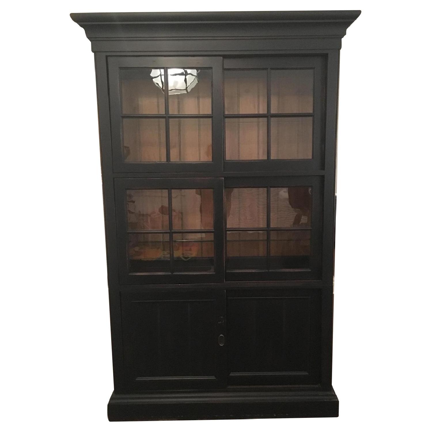 Seller's Notes:Handcrafted. Classic with a modern edge, this handsome storage cabinet has an upper section with three glass shelves with plate grooves, sliding doors with antiqued glass, and two interior lights with dimmer. The generous crown molding lends stature Upper sliding doors with antiqued glass panes Three glass shelves with plate grooves behind sliding doors Two recessed lights with dimmer Made in USA I am selling this piece because it will not fit into my new townhouse. The piece has some scratches and stains on the bottom from being in storage for the past 5 years while I lived abroad. It still has some great years left and needs a polish to get some of the blemishes out.