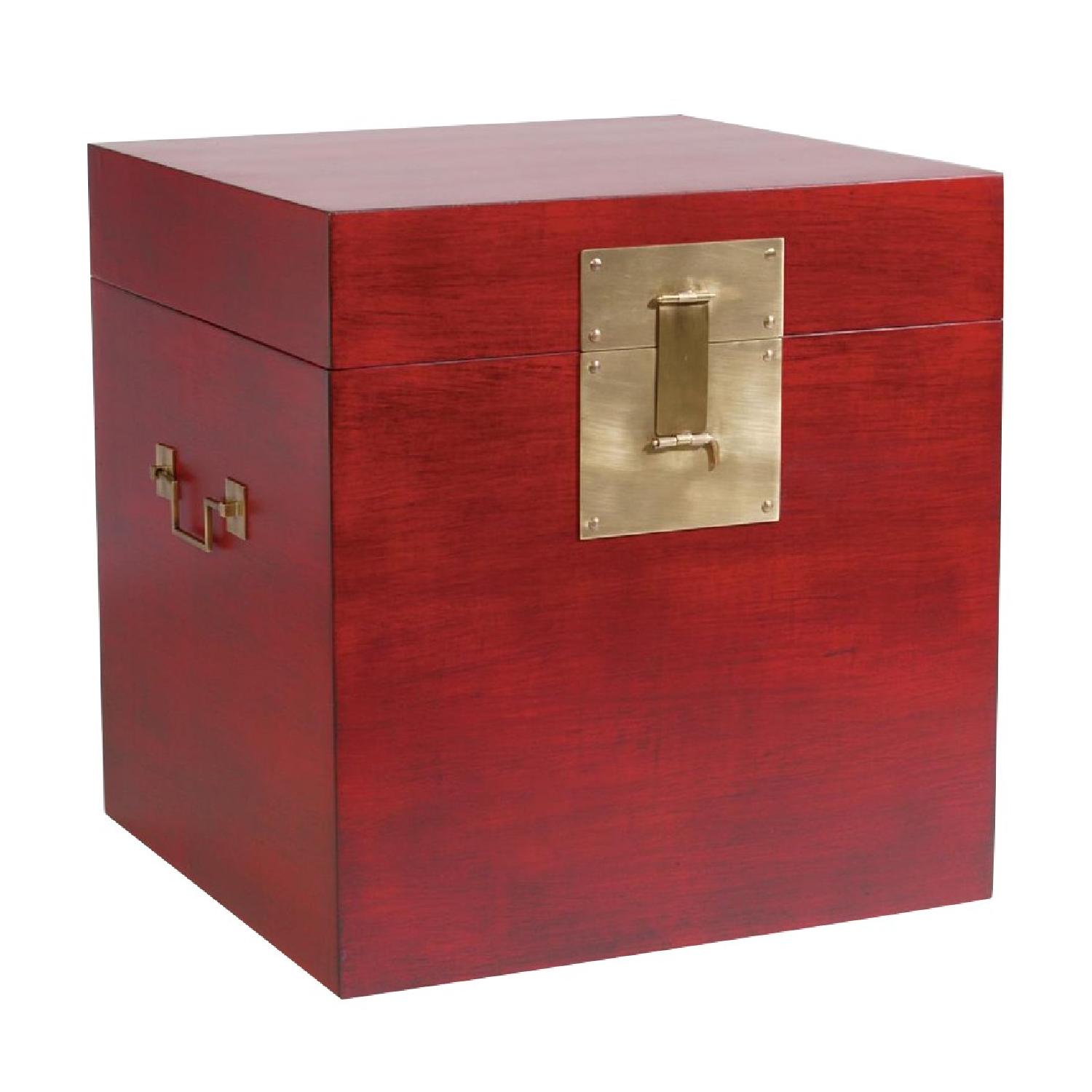 Seller's Notes:This is a very versatile piece. It is reddish brown, not red. It is a storage chest, but looks like a side table. It is very pretty with brass handles. My grandchildren used it to hide inside of, so it is off the hinge, and has "been through the mill", but that isn't noticeable from the outside. I decided that I don't really need it.