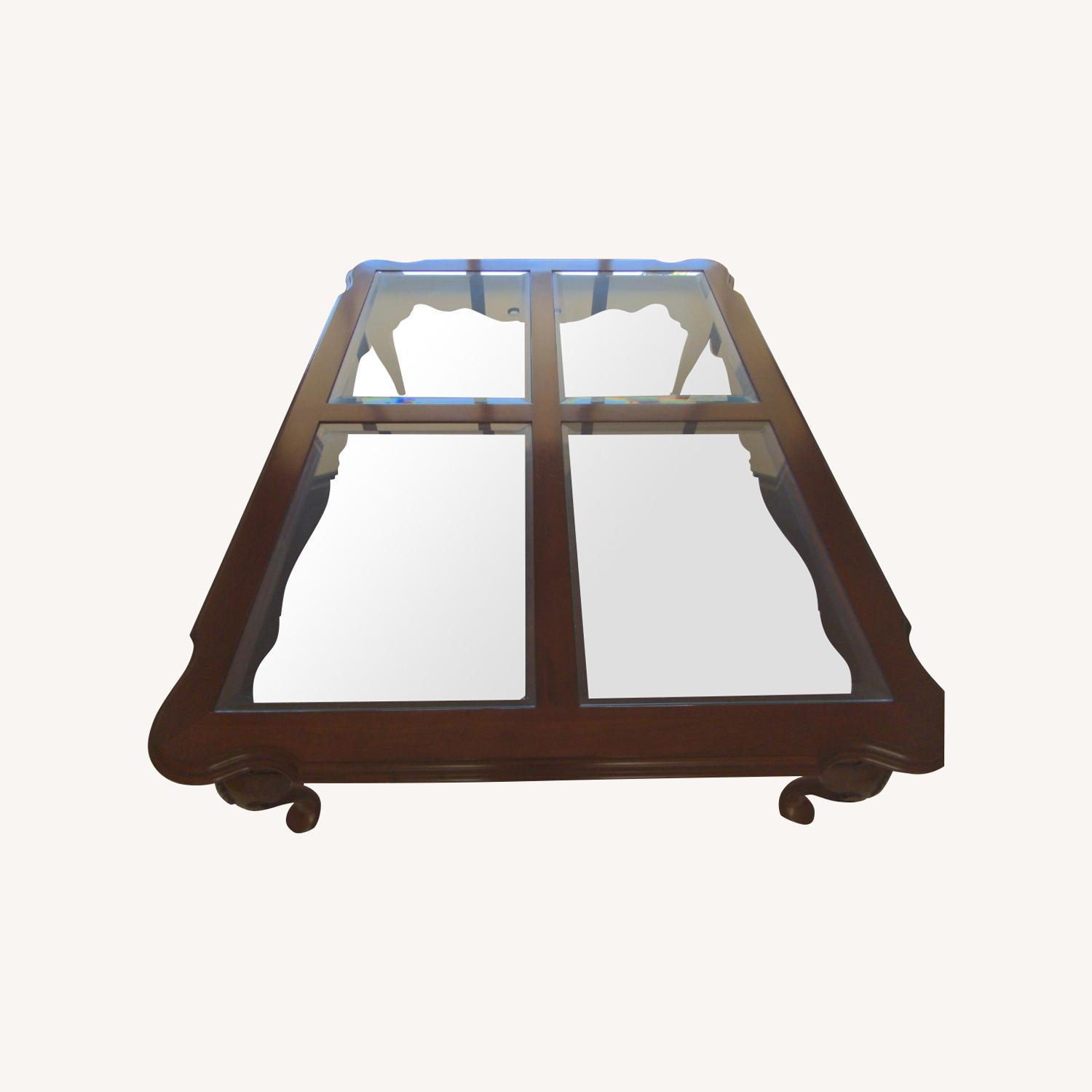 Seller's Notes:This Ethan Allen piece from the Georgian Court line was purchased new in 1993, and this classic style is making a comeback! It's beautiful solid cherry wood in excellent condition, regularly maintained and free of dust or any kind of grime. The crystal-clear, sectioned glass top is free of scratches, nicks or chips.