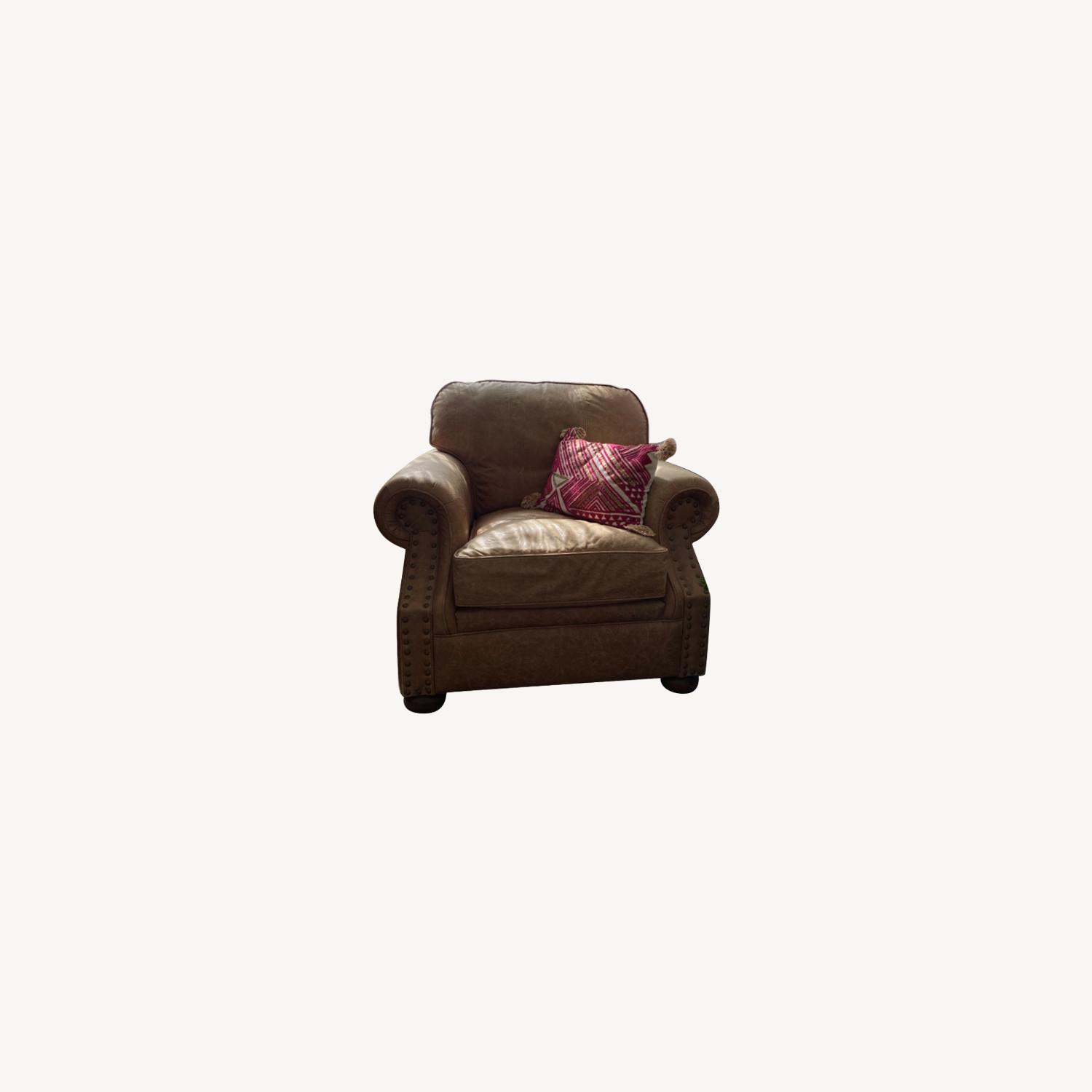 Seller's Notes:This is a great Ethan Allen set. The chair was used as an accent chair so never got much sitting use. The condition is good, the arms, top and back have fading from the sun and can prob use a little leather oil but it’s perfectly vintaged. Great quality piece. Can be sold separately, just ask.