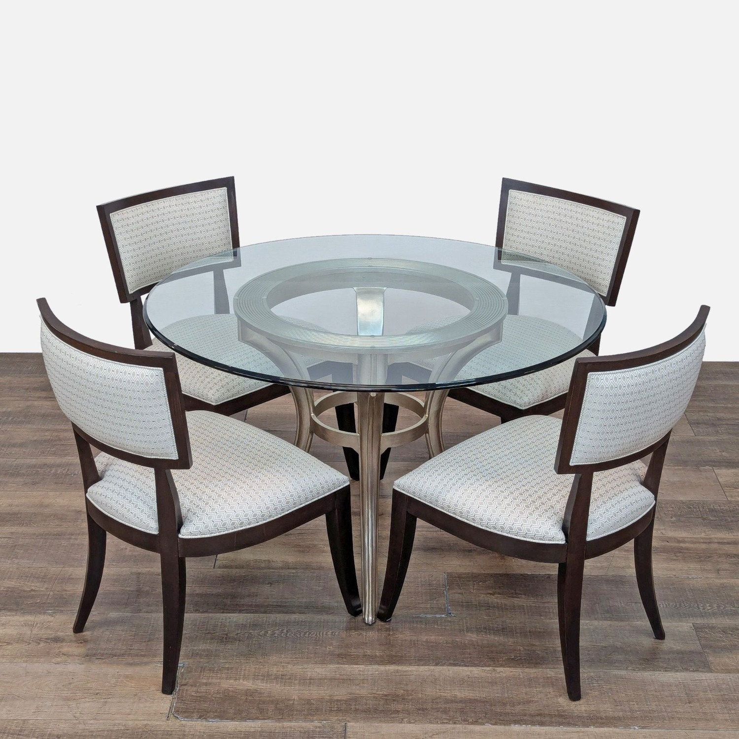 Seller's Notes:Glam round glass top dining table with metal base and four Adrian upholstered dining chairs.