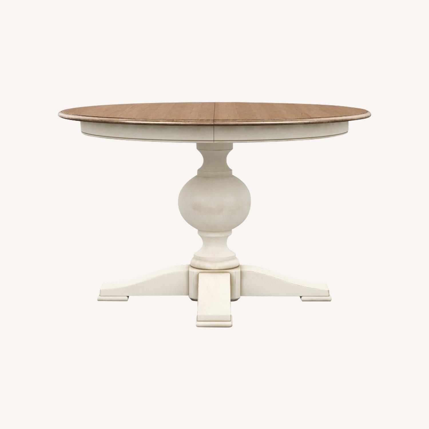Seller's Notes:Selling an Ethan Allan Cooper Round Dining Table. The reason for selling is that we have moved property and doesn’t fit our space anymore. It is a great table and has the option to add extend to go from 4 people to 6 people. Farmhouse fresh with modern appeal. This elegant table fuses charming country influences with a bold pedestal for an updated vibe. 48" table extends to 66" with one 18" leaf. Seats up to 6.