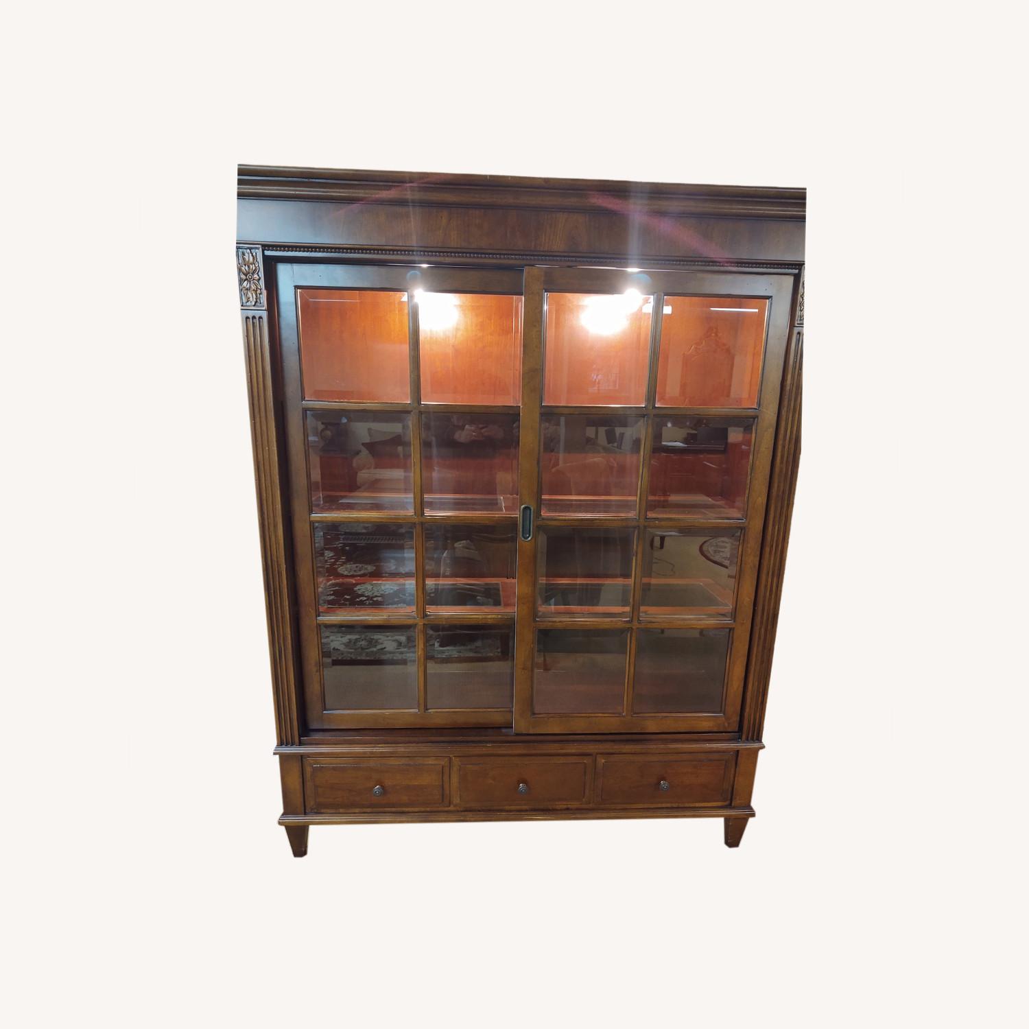 Seller's Notes:This beautiful Display case is, rich wood,beveled glass and the curio is truly magnificent. No damage,scratches ,or gouges, on the finish. Has sliding doors and accent lights for interior display.Beveled glass creates a lovely glow! There are spacious drawers in the bottom for storage. Ethan Allen furniture is built to last a lifetime. The future fine antiques. A chance to buy a flawless cabinet at pennies on the dollar vs new!( 48 HOUR SALE) DON'T WAIT IT IS PRICED WELL. This same unit is on 2 different sites for 1200 more. This is value!