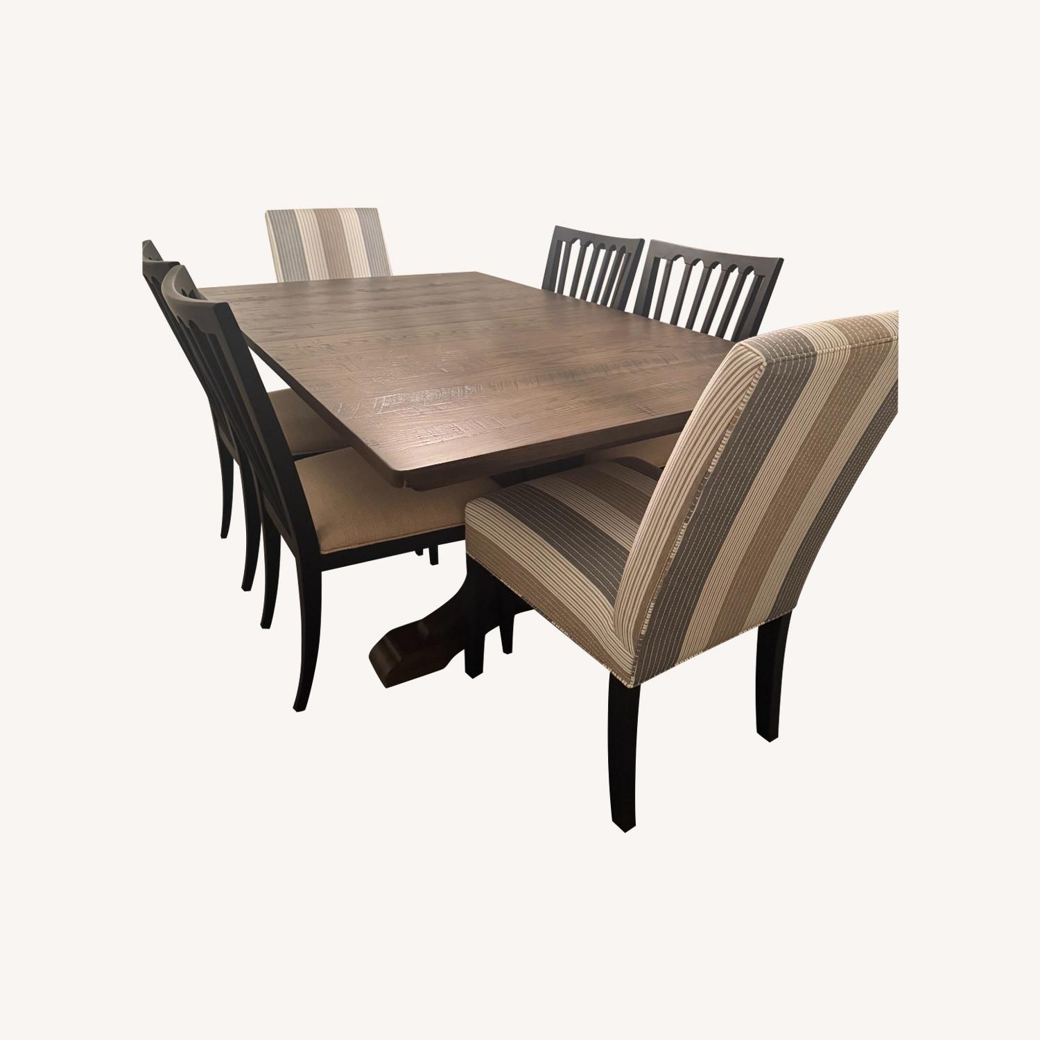 Seller's Notes:Ethan Allen Corin Collection Trestle Table with 6 Benham side chairs and 2 Thomas dining side chairs. Includes two 20 in leaves and table pads.