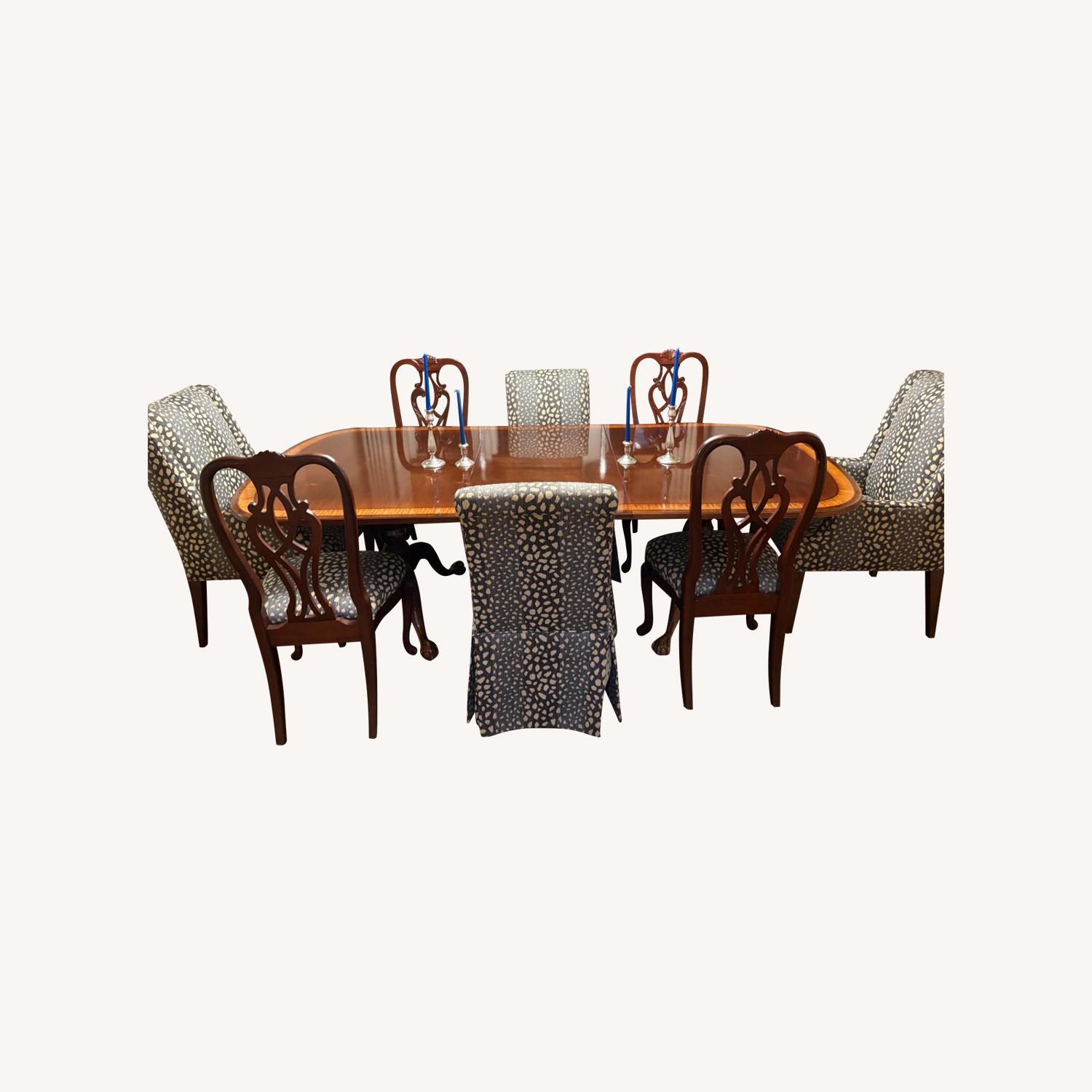 Seller's Notes:We are selling our home and downsizing. This dining room does not fit in our new house. It has 8 seats and 2 leaves that are not shown in this pic. So the table can get much larger. The chairs were re-appolstered 3 years ago by a designer.