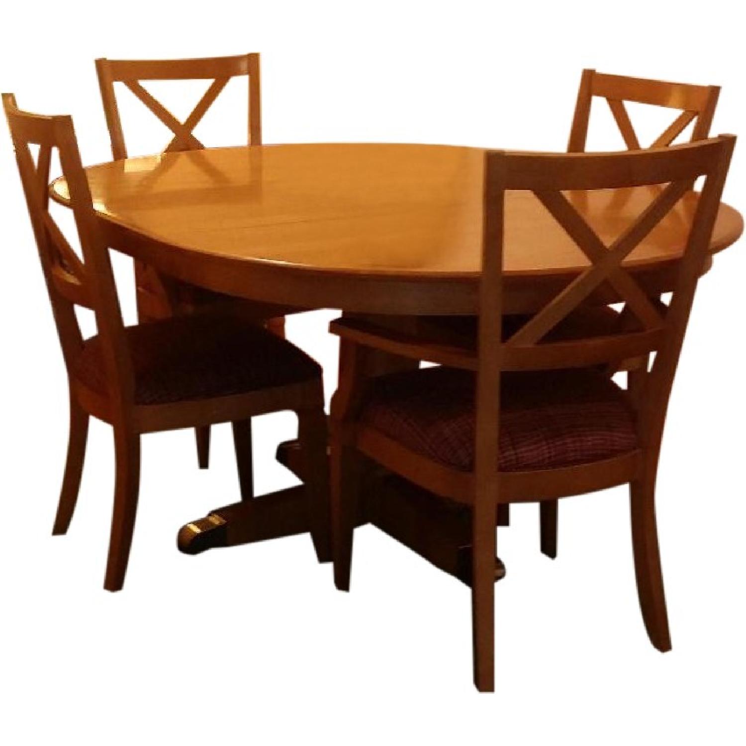 Seller's Notes:This round pedestal table (along with the cross back chairs) makes a perfect set. The table is very solid and sturdy. We prefer the table with the leaf and secured it with a wooden slab because our floor isn't leveled - see picture. The only reason why we're putting it up for sale is because we're moving - it will serve you well.