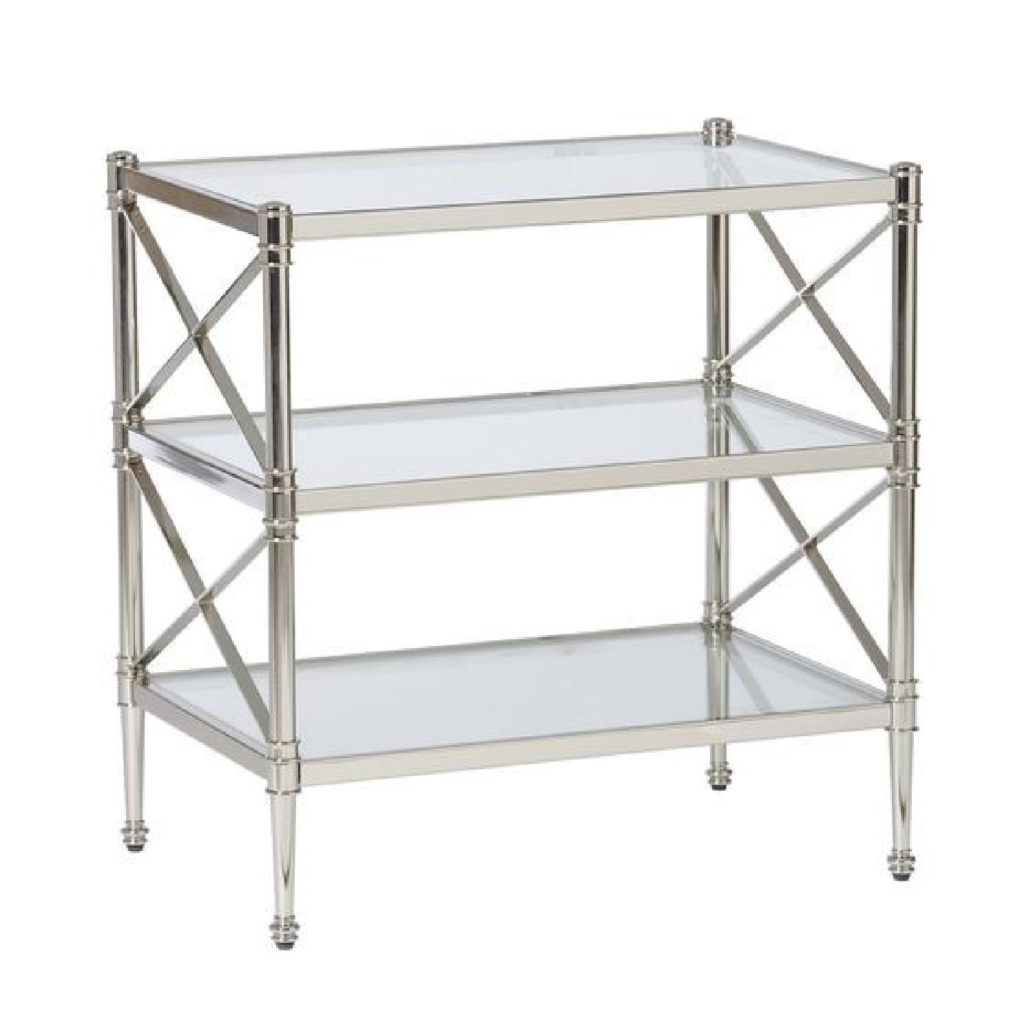Seller's Notes:These polished nickel and glass tables are both glamorous and highly functional. We have used them as bedside tables but they are stunning end tables for any room. We have owned them for 7 years and yet they look like new! We are moving and cannot take them with us . . . which is making me very, very sad.