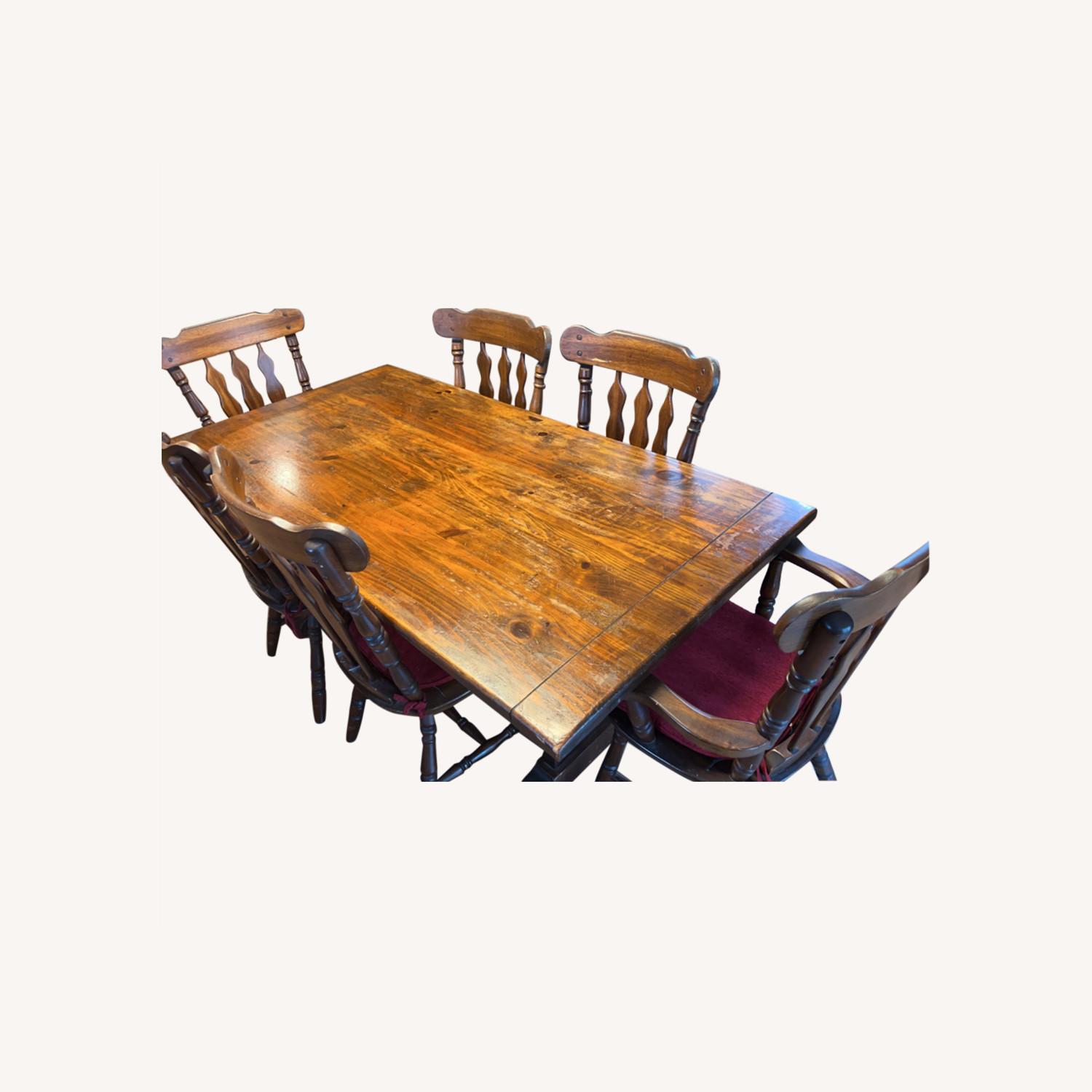Seller's Notes:Farm style? Table 3x6’ with 6 chairs and red seat cushions. Great worn look. Lots of life in it still.