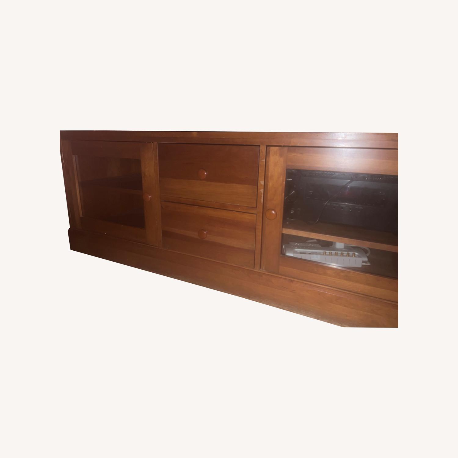 Seller's Notes:Beautiful wood media console. Has been through a few moves from 3 different apartments. Needs some touch ups but is 100 percent able to bring back to perfection. Retailed for $4500