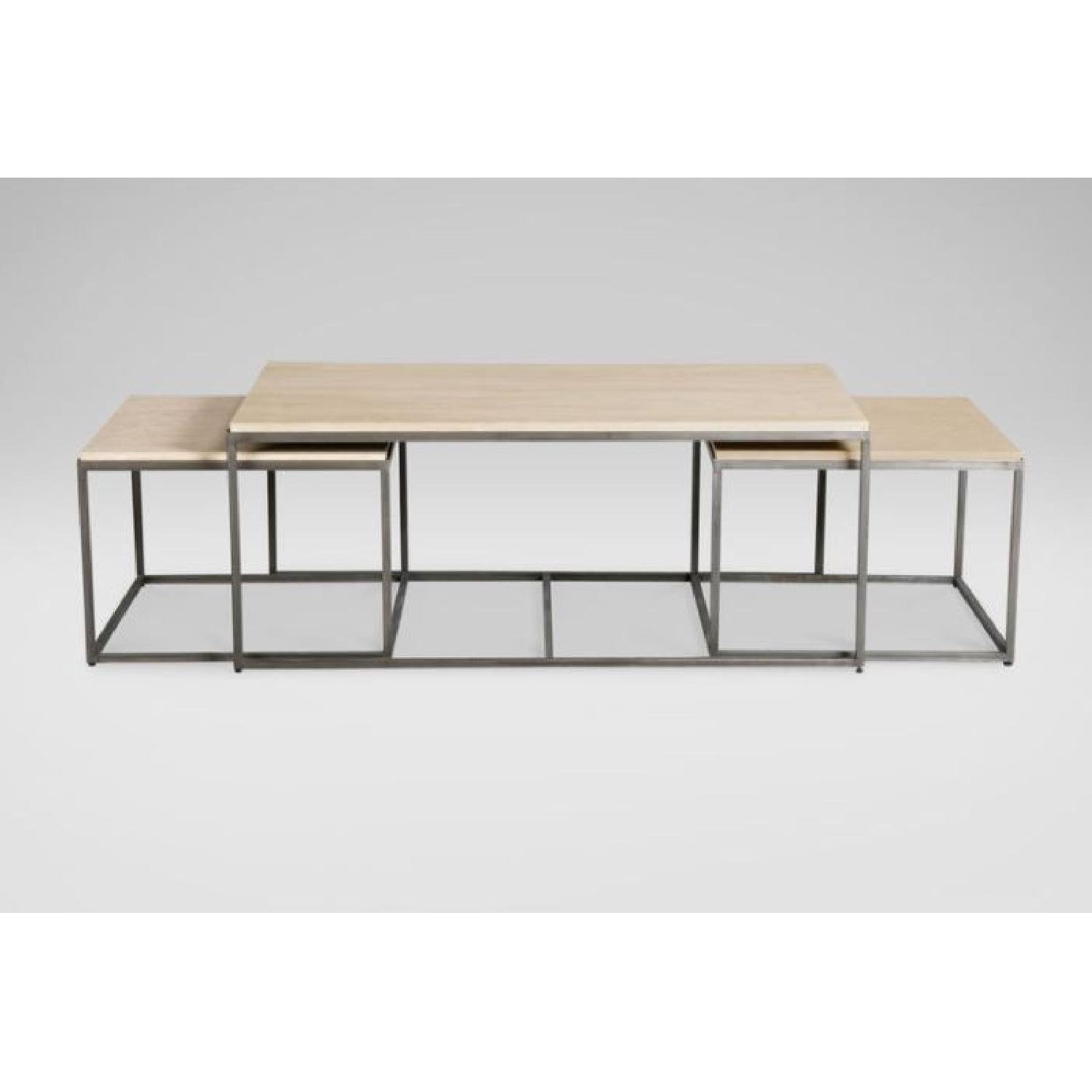 Seller's Notes:Amazing condition! Three tables in 1! Three, two, one. This trio of tables conforms to your needs. Custom-size to the length of your sofa, or pull apart and use all three when extra surface space is needed. The creamy travertine stone veneer top is lighter, stronger, and more stable than solid travertine limestone. Crafted from steel and travertine Finish (191): Antiqued pewter-toned metal finish base. Honed travertine veneer top Antiqued pewter finish base Dimensions reflect size when tables are fully nested