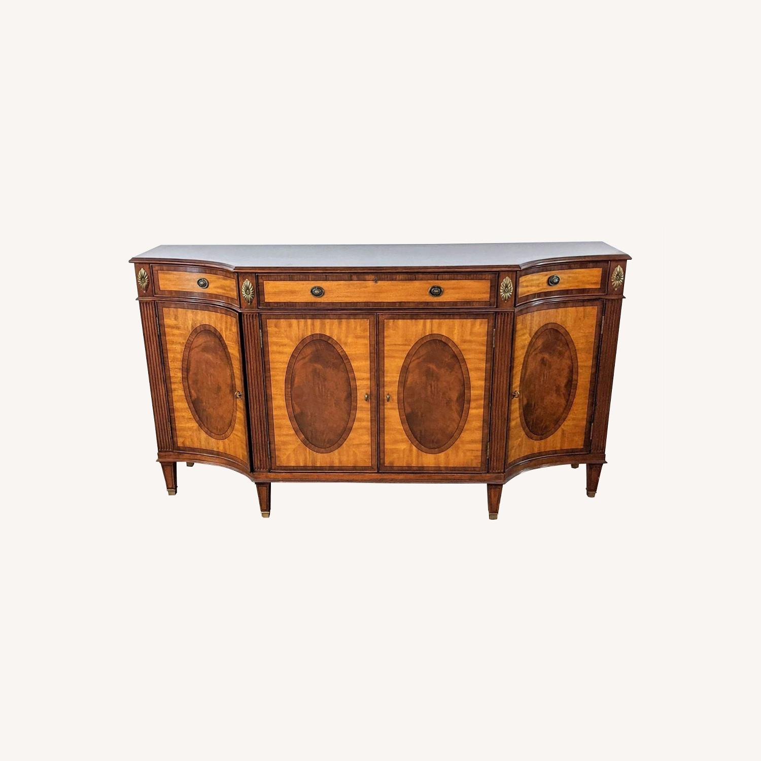 Seller's Notes:Mahogany four door sideboard with cameo swirl veneer, inlaid panels, and dovetailed drawers. Brand: Ethan Allen. Model: . Retail price: 6960.00. #SKU: 1052120