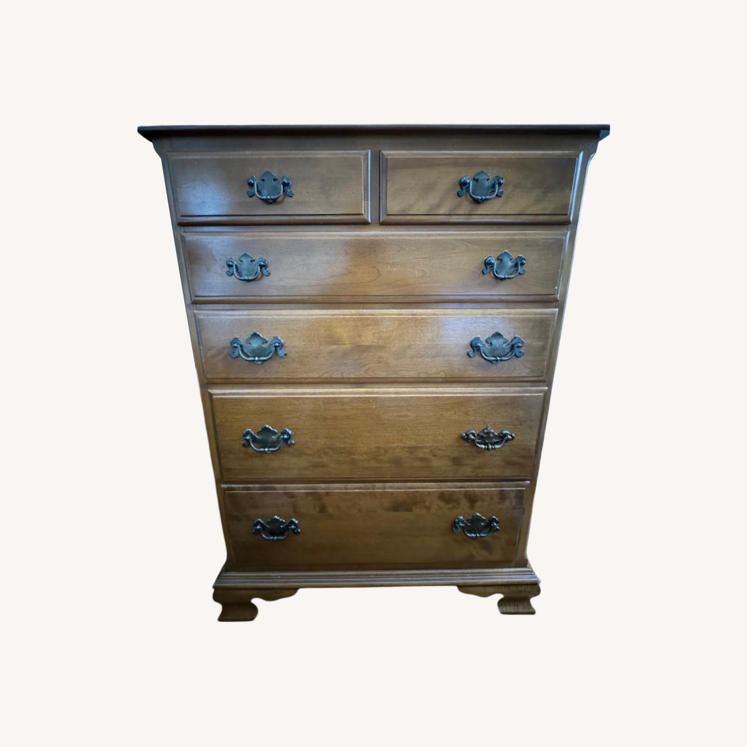 Seller's Notes:My girlfriend and I are changing the vibe of our apartment and it’s time for our bedroom to be done! The rocking chair on my profile was what we accented with this Ethan Allen chest. This is 1980's beautiful Nutmeg chest of drawers made from solid maple in Colonial style by Ethan Allen. Features six various drawer dovetailed construction - two small over 4 regular. Accented bat-wing bail pull provide ample storage space for clothes and other household items. Two drawer still has dividers for easy organization. Rested on bracket feet. With its classic design and high-quality craftsmanship, this chest of drawers is sure to impress. It is very well maintained in vintage original condition without issues. Photos will show any blemishes which if you aren’t looking for you’ll never notice. Structurally sound and sturdy with clean and functional drawer.
