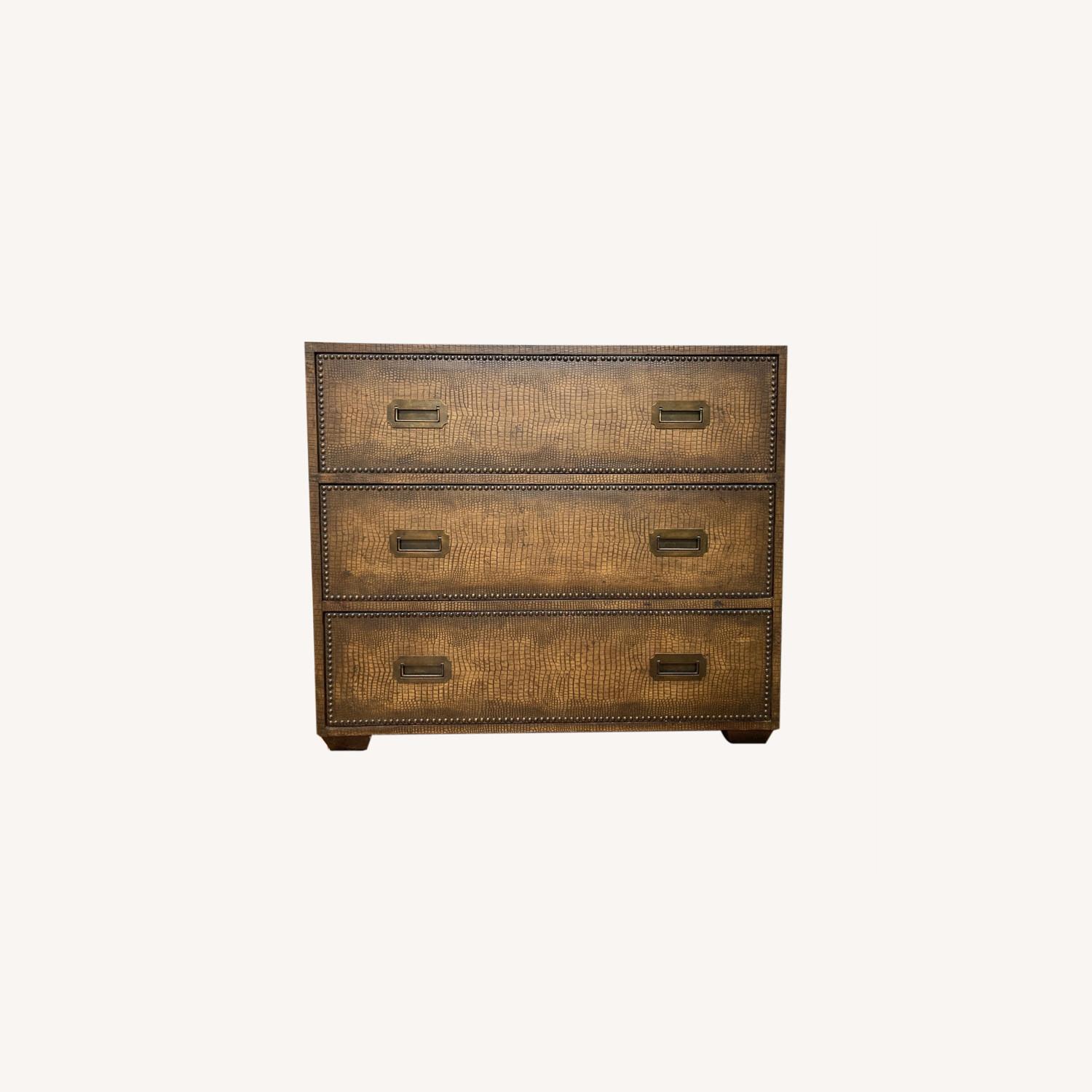 Seller's Notes:Ethan Allen Collection: Collector's Classics Item# 129055 537 Finish: Mangrove(587) Embossed faux-crocodile leather surfaces Three drawers with recessed drawer pulls Levelers