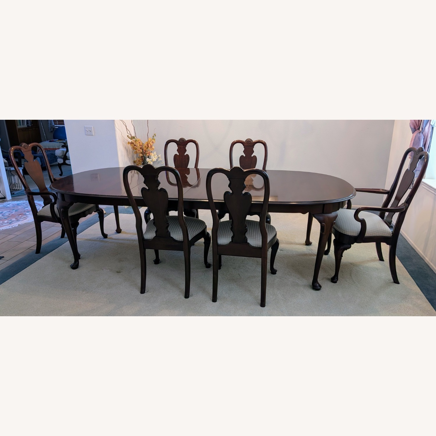 Seller's Notes:Ethan Allen Georgian Court Queen Anne Style Cherry Wood Dining Table and Chairs - Set of 7