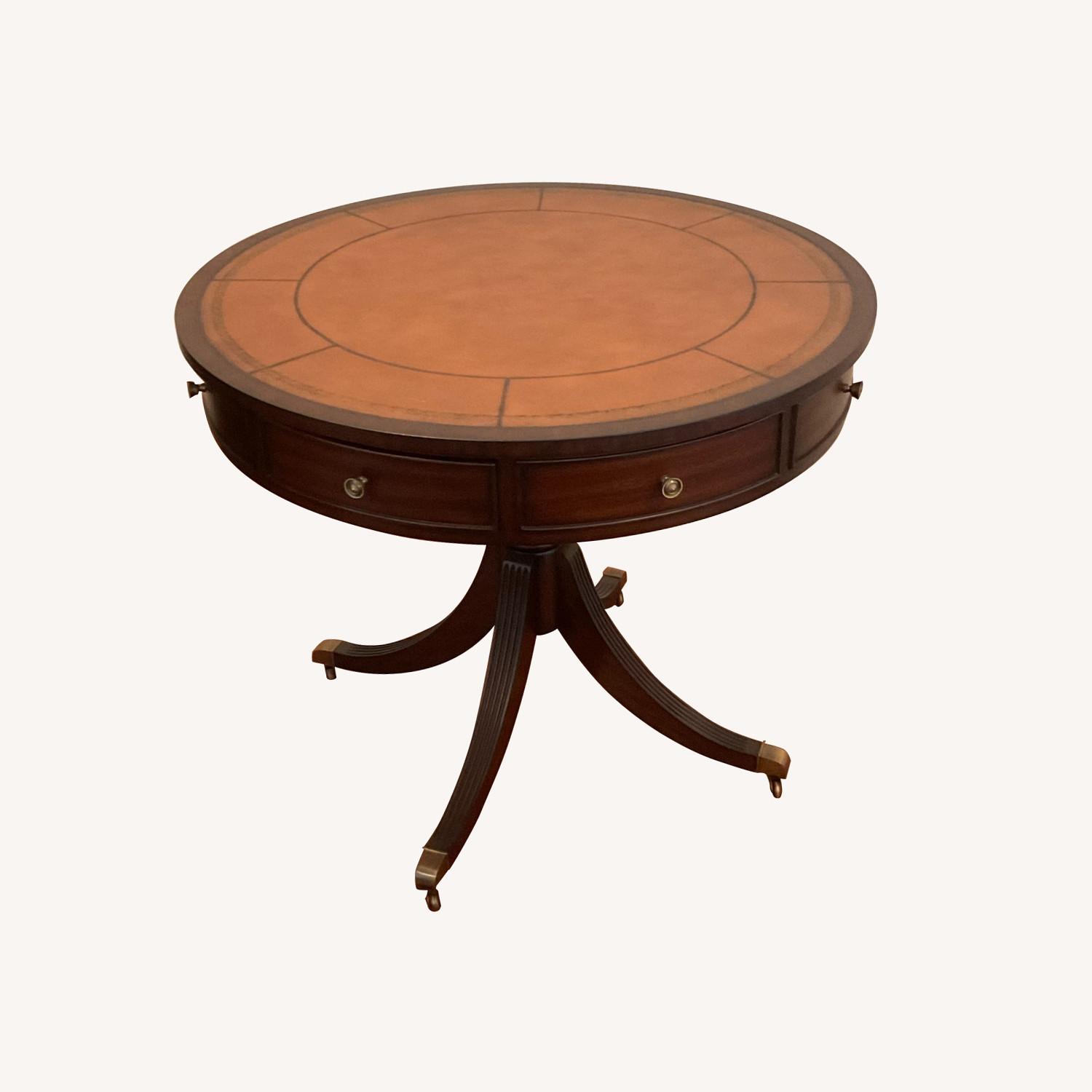 Seller's Notes:Ethan Allen round wood end table with leather in lays. Piece has drawers for handy storage. Very gently used as was in the great room which only got used on holidays. For full disclosure the has a small imprint of lamp base, but not very noticeable and does not show on the photo of the top of the table.