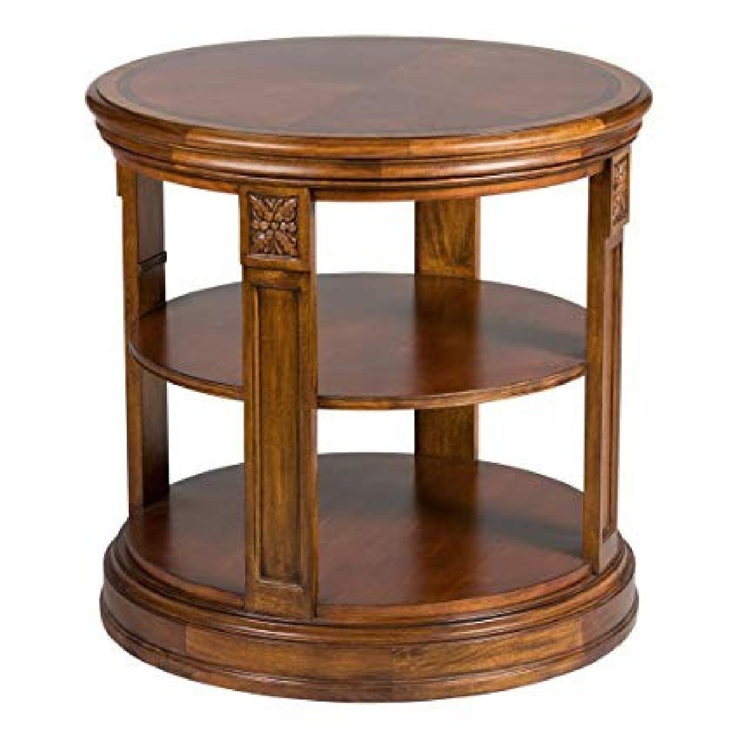 Seller's Notes:This is an Ethan Allen Seaver Library table in near-new condition. From the manufacturer: Generous in scale yet open in feeling, the Seaver table has an alder frame with carved rosettes. Its marquetry top features a radial cherry veneer, surrounded by wood inlay. With one fixed shelf and four posts, it’s a handy chairside companion. Crafted from Indonesian mahogany solid, ropey cherry, primavera, walnut and tulip veneer inlay on top Radial-matched veneer top surrounded by ebony inlay One fixed shelf Carved floral rosette on each post Finish: Henley (430): Amber transparent spatter stain, deep sepia glaze, lightly distressed, burnished edges.