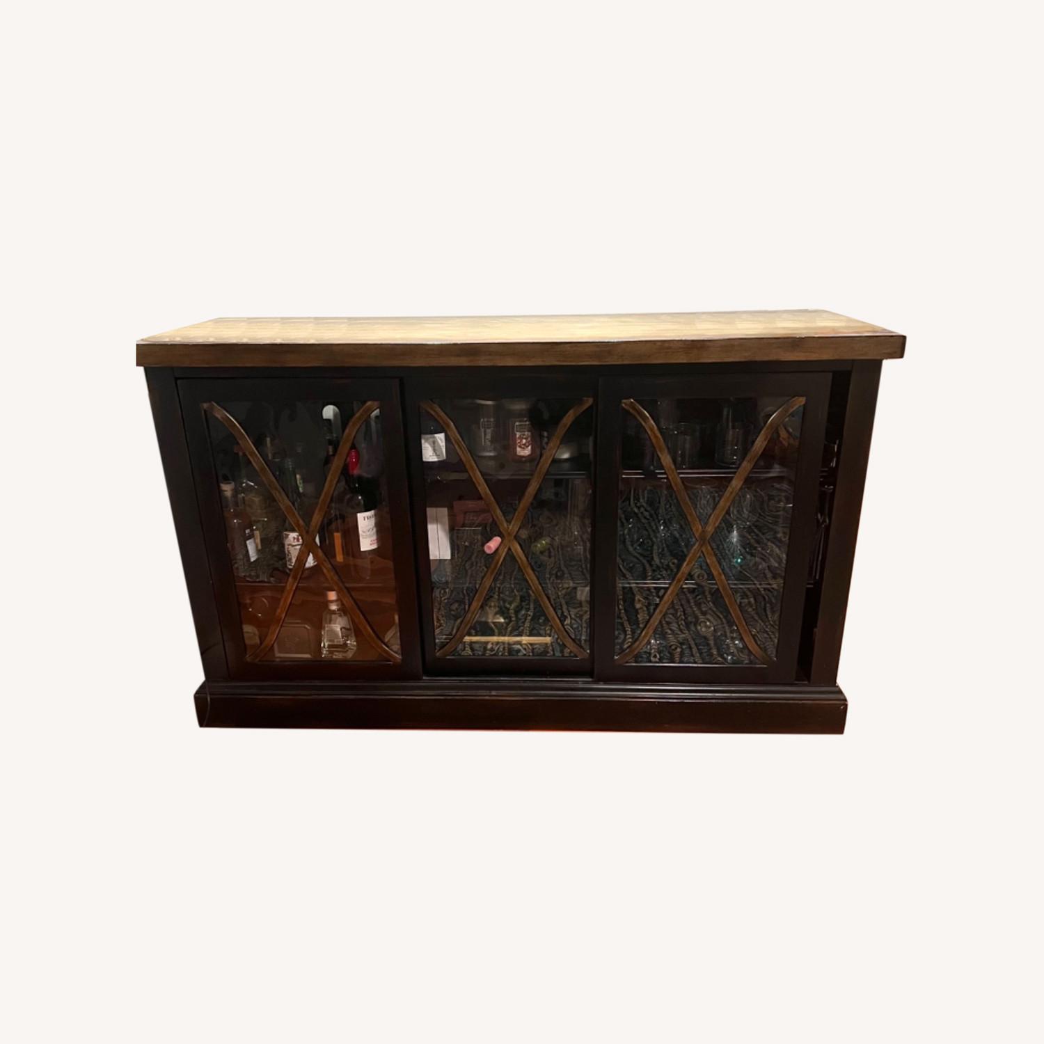 Seller's Notes:Black server with Brushed gold / silver finished top with brushed accent crisscross on sliding glass doors, electrical outlets inside
