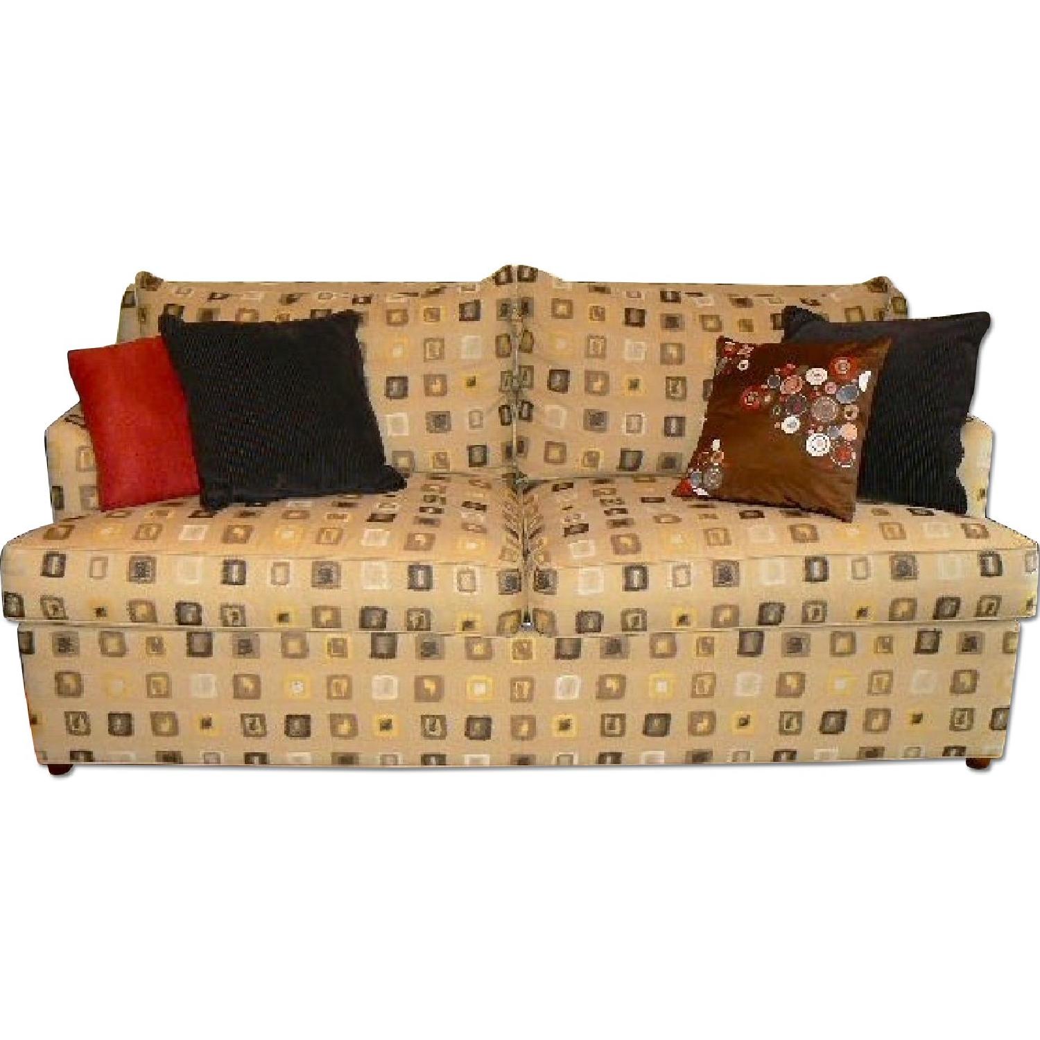 Seller's Notes:This 2 cushion custom sofa is upholstered in "wheat brush". It is extremely comfortable, great for watching TV or taking a nice long nap. It is in PERFECT condition and of excellent quality. BONUS: All throw pillows in the photo are included