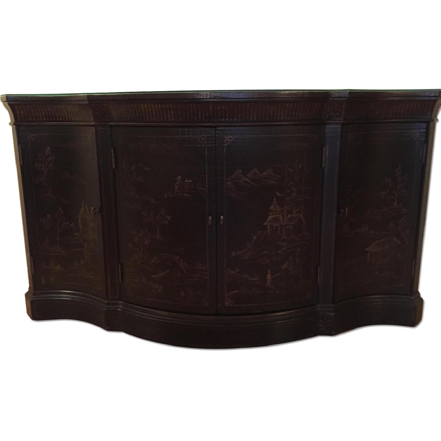 Seller's Notes:- Nearly mint condition - New item (not including $200 custom glass top) costs $1929.00. See manufacturer website. - Chinoiserie finish From the EA website: "Here’s a statement piece with dreamlike Chinese landscapes painted by hand on the front, sides, and top. Skillfully crafted with a narrow profile that affords ample storage, it’s finished in black with a lacquered gesso glaze for an authentic antique look. Crafted from canvas over engineered wood Classic, Chinese-inspired painted chinoiserie landscape design on black backdrop Lacquered gesso surfaces create a faux canvas crackle finish Four doors and one adjustable shelf behind each door"