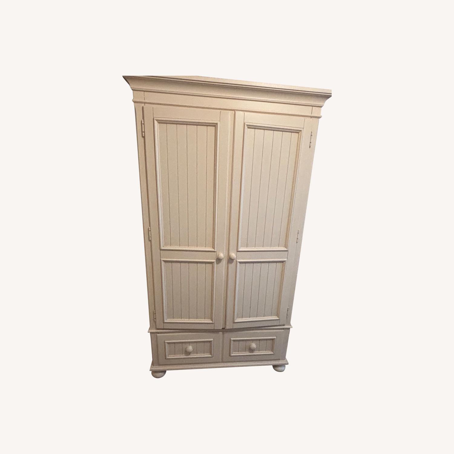 Seller's Notes:Great condition Ethan Allen antique white painted paneled wardrobe in a French country style. This armoire has a pair of cabinet doors with a clothing rod, two adjustable shelves, and four accessories drawers. The interior front doors feature a mirror on one door and cork board on the other. Very lightly used in a childhood bedroom and ready for the next owner!