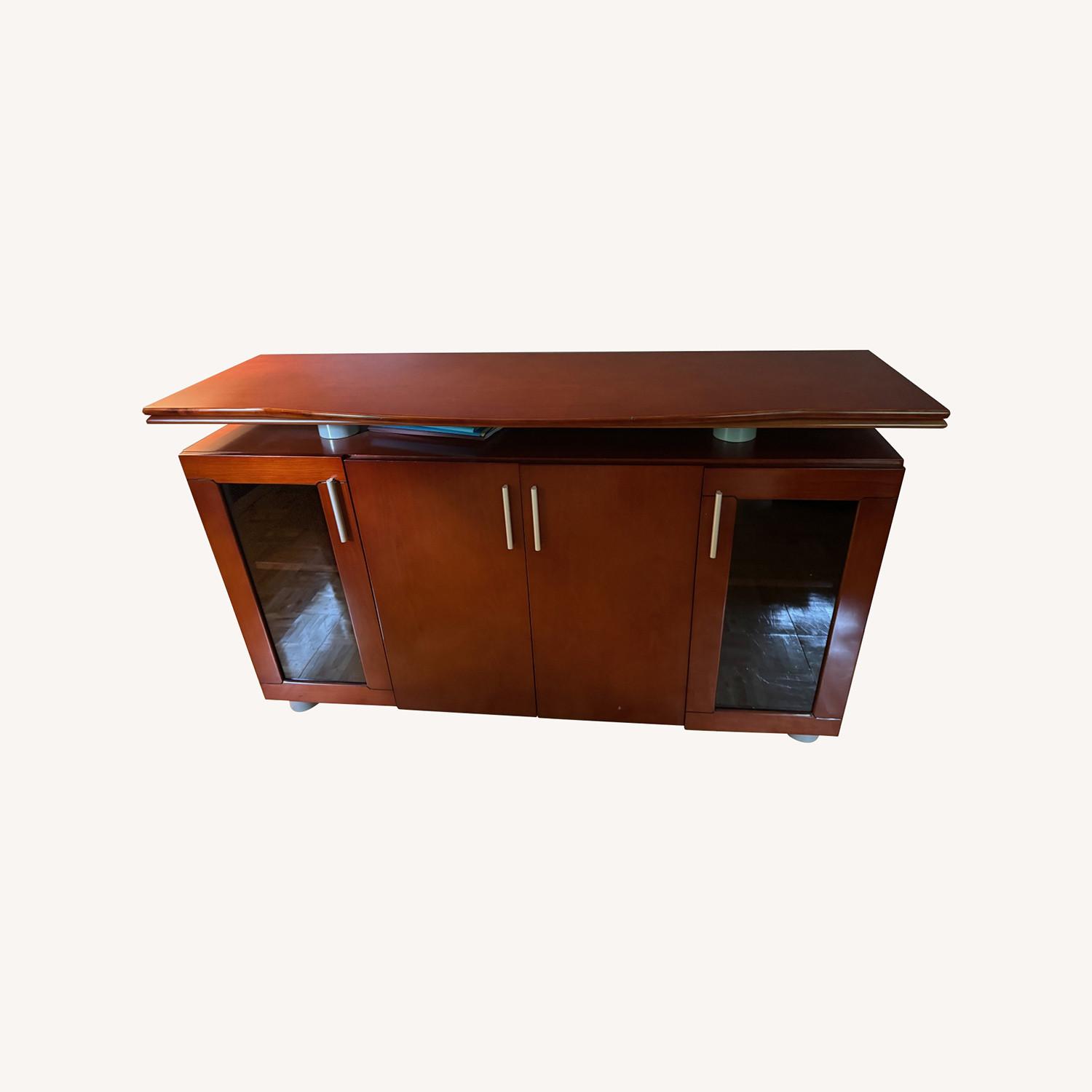 Seller's Notes:Cherry veneer legs, 15mm frosted temper glass top on desk Mobile three drawer pedestal with lock Credenza with smoked glass doors 63w/19 5/8D/35.5H Absolutely beautiful set I hate to part with but am losing my home office due to a remodel! Gently used, purchased in 2013.