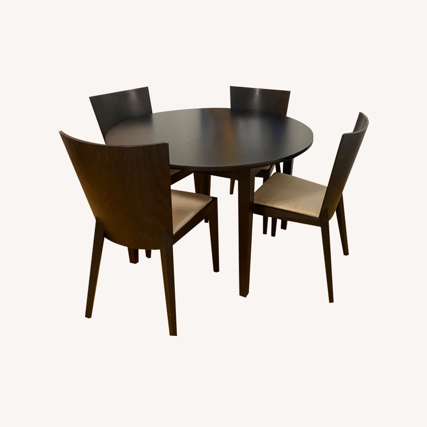 Seller's Notes:Selling table and 4 chairs. The table features a self storing leaf that is completely hidden in the table when closed. Self storing leaf is a breeze to use (can be opened or closed by one person). Table is 43 inches round when closed; 57 inches oval when open. Chair seats are cream in a woven fabric. Great condition with minor scratches. I’m selling because we need a bigger table. Table and chairs made in Italy.