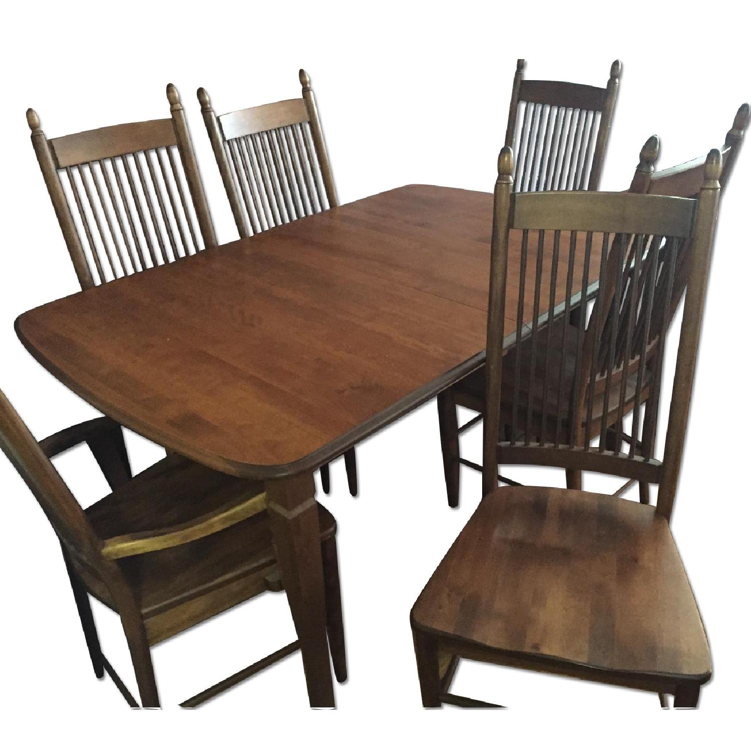 Seller's Notes:Cherry Dining Table with 6 Chairs and Leaf Extension - Barely used, impeccable condition - 6 Chairs. 4 spindle back chairs with 2 spindle back armchairs for table ends - Leaf for extending table for entertaining friends and family - Table dimensions are: 59" length x 40" width x 30" high; Including leaf, table dimensions are: 77" length x 40" width x 30" high - I purchased the set for $2,400 and has barely been used. Moving to a smaller apartment so can no longer use. Great condition!!