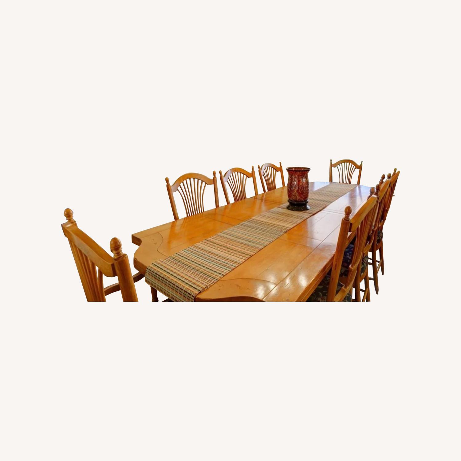Seller's Notes:Lexington Country French table for 8 with two 18" drop-in leaves that expands seating to 12 Solid Eastern Pine hardwood with Tuscany finish - no veneer! Table comes with 8 chairs, 2 stools, a custom made table runner with complimentary fabric to the chairs and 54" x 117" of unused table runner fabric. We are moving to a smaller home and unfortunately, the table will not fit. Our loss could be your gain!