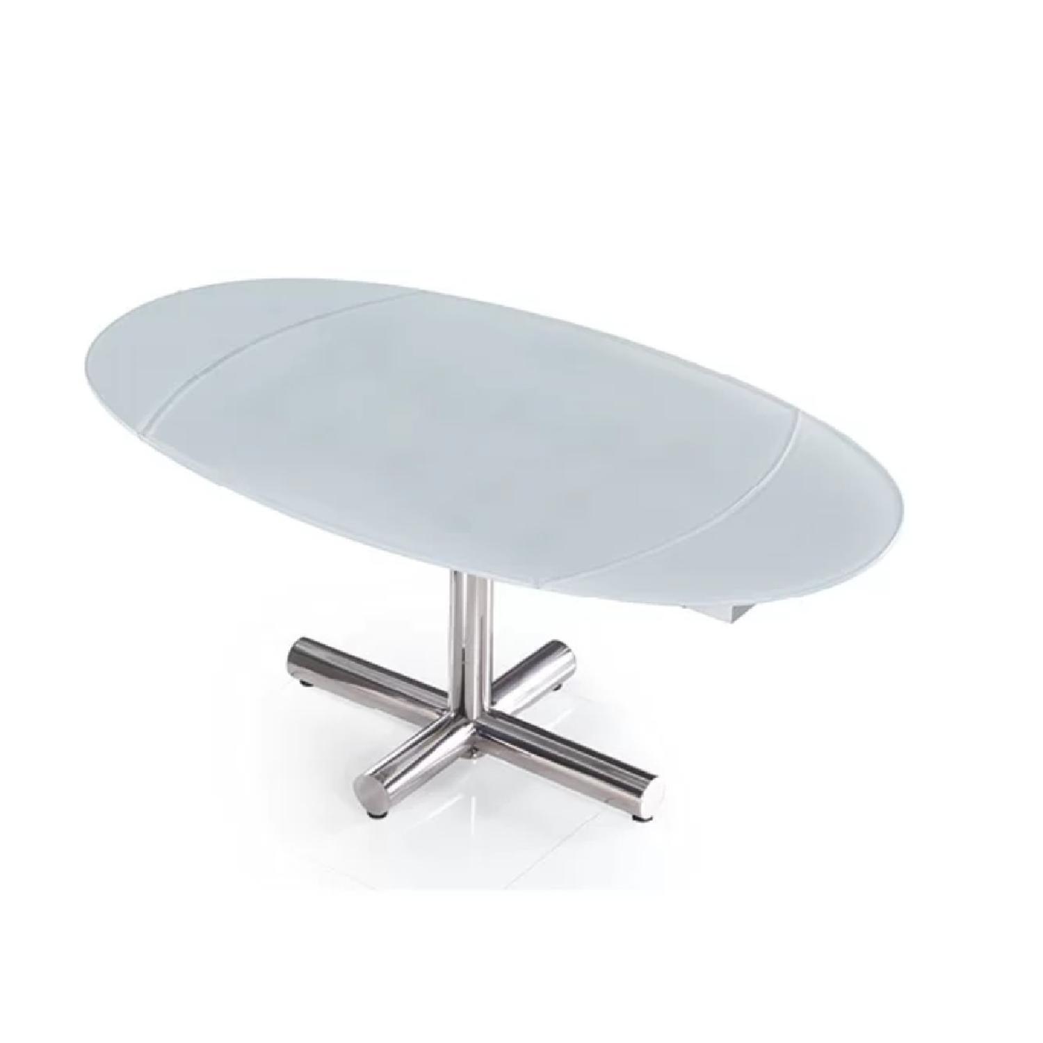 Seller's Notes:Contemporary dining table extremely durable & functional. It is made from tempered glass and has a chrome pedestal base. Extendable to 71'' (normally 45'') by simply spinning the top. We purchased the table then realized the glass doesn't match the rest of our furniture, so we're selling at a HUGE discount to what we bought it for. The table is literally still in its original packaging and has never been opened yet. That's why we have to show you pictures online.