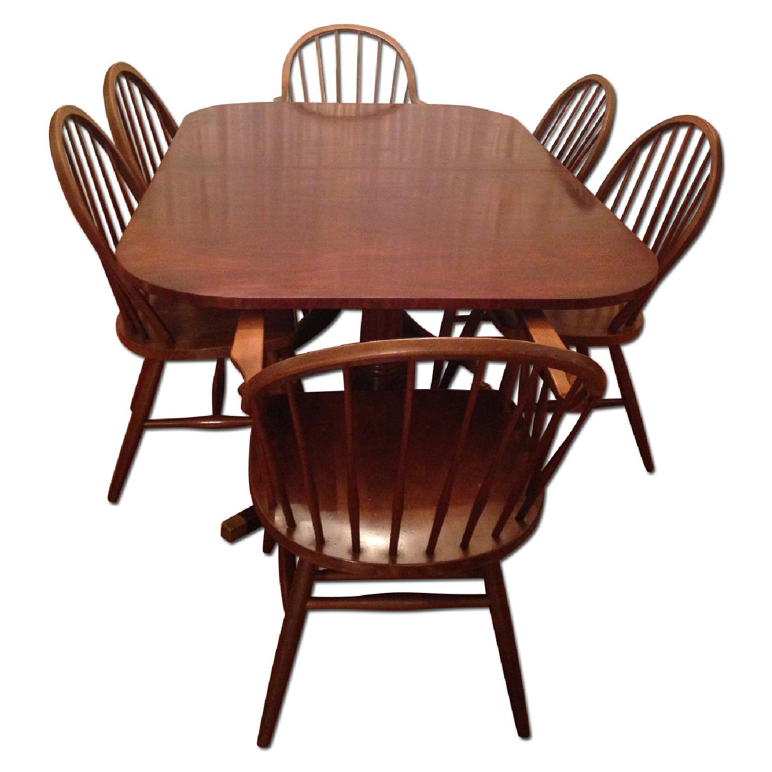 Seller's Notes:My parents purchased this dining table set 20 years ago in the West Village at a store called Gotham Galleries (which doesn't seem to exist anymore). We enjoyed many a family meal at this table and my mom made sure to keep it in tip-top shape -- never once allowing a drop of liquid near the glossy finish. They are downsizing to a small apartment so don't have a need for such a large table anymore. Some additional details: - In its standard setting, it can seat 6 people - two chairs on either side and one at each head. - There are two extendable boards which can be inserted in the middle which add can double the seatings (I think we've even fit up to 14 at the table when fully extended) - The table comes with 6 matching chairs -- two "head-of-the-table" chairs with arm rests and 4 regular chairs without arms (see pictures of chairs). Chair dimensions below: Head-of-the-table chairs: 23 1/8" W (arm-to-arm) x 17" H, backrest: 19.5" H Regular side chairs: 17.5" W x 17" H, backrest: 19.5" - The table sits on legs with casters so table can be moved/rolled easily