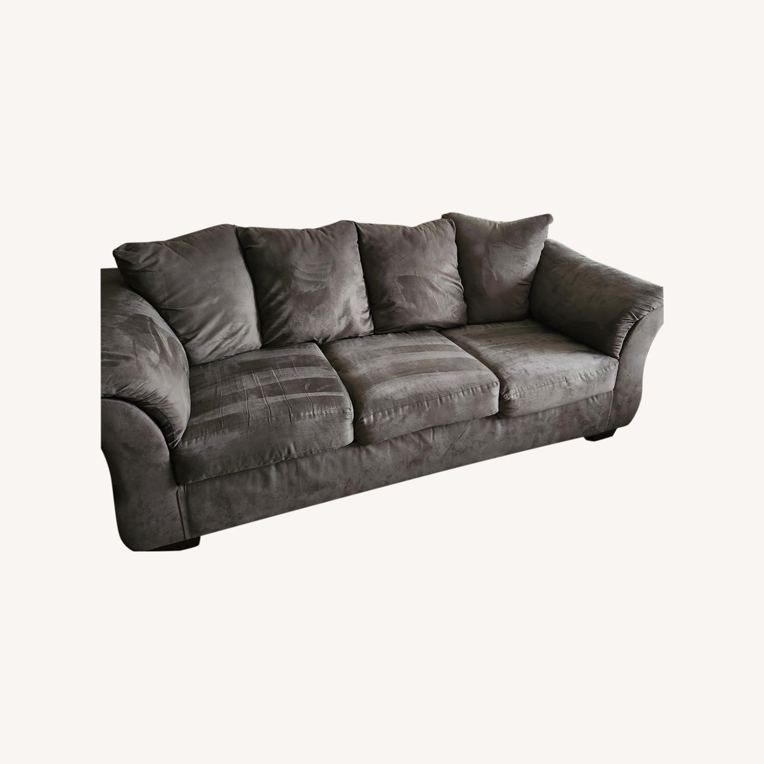 Seller's Notes:Signature design Ashley greenish gray velvet fabric smooth soft sofa that i want to Talk about fine lines and great curves. That's the beauty of this standout sofa—made to suit your appreciation for clean, contemporary style. A striking flared frame, comfy pillow top armrests and an ultra-soft upholstery that holds up to everyday living complete this fashion statement. removable seat cover and machine wash.