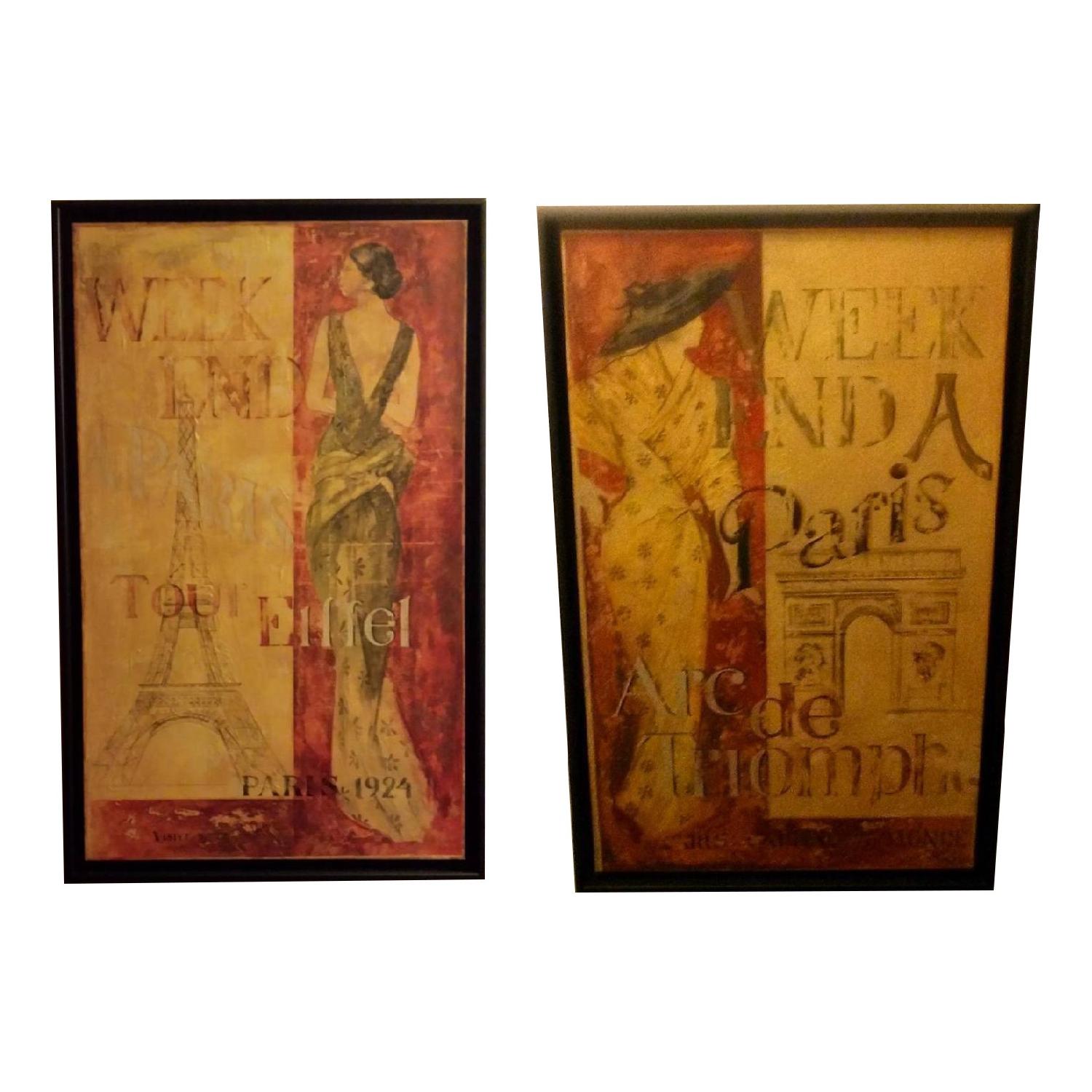Seller's Notes:Set of 2 French themed paintings by Fabrice De Villeneuve measuring 23" by 37" each. "Charmingly tattered and softly faded, Fabrice De Villeneuve’s nostalgic “Paris, 1924” exudes the character of an elegant antique. A contemporary artist, De Villeneuve is strongly influenced by his lifelong love of antiques and nature. Rendered with touches of inspiration from 17th and 18th century art, De Villeneuve’s work encompasses florals, interior scenes and trompe-l’oeil. His artistry has appeared in numerous distinguished publications, including Maison et Jardin, Marie Claire and Art and Decoration. Pairs strikingly with "Arc de Tr
