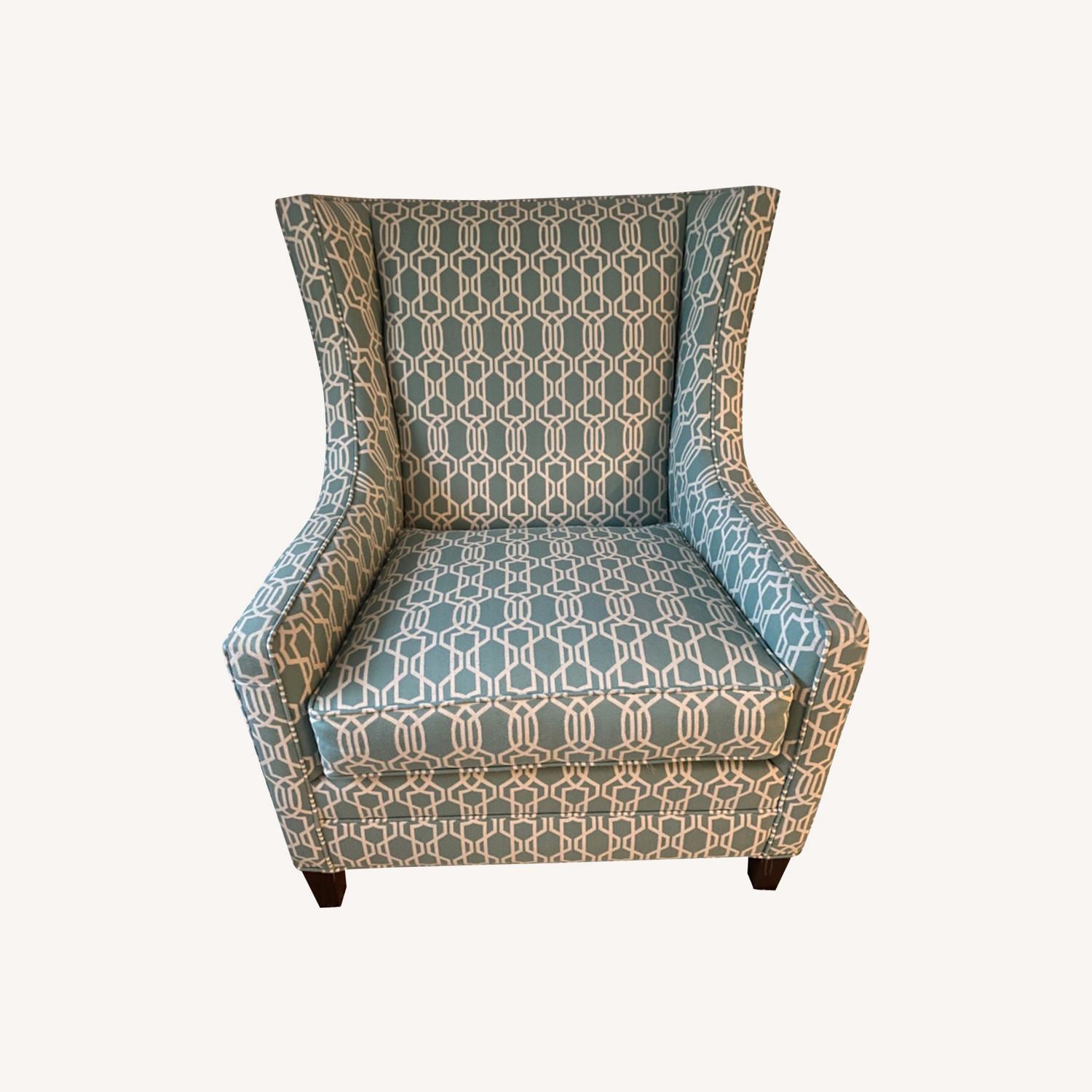 Seller's Notes:Set of 2 custom upholstered Fairfield Furniture wingback chairs, lightly used in a low-traffic formal sitting room. Teal color with a modern pattern. Retails for $1850 each.