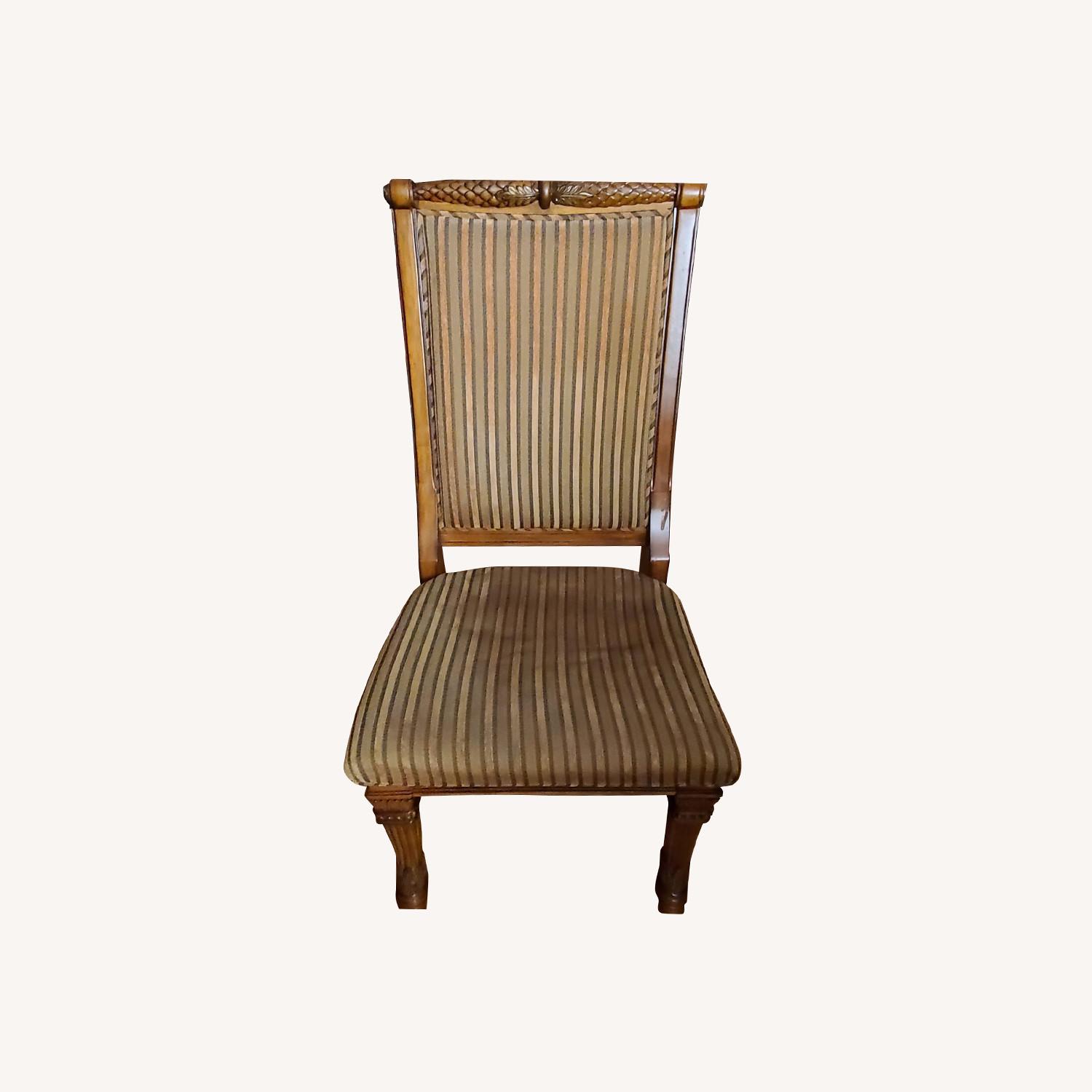 Seller's Notes:This is a set of six traditional dining chairs that will go well with a classical design of a dining room. Two chairs, that go to the head of the table have “arms”. Others do not.