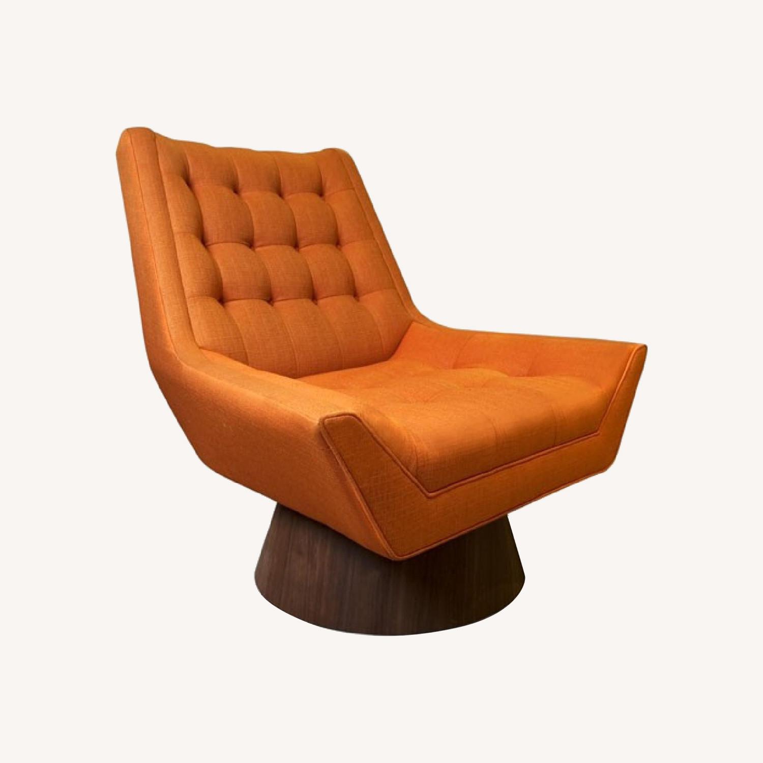 Seller's Notes:The chair retails for $2,250.00. This is the description from the Jonathan Adler site: Nostalgic Futurism. Our Whitaker Swivel Chair transcends the boundaries of space and time. Flared, angular sides with piped edges are contrasted by a clubby, conical wood base. Big and comfy with luxe button-tufting and a spacious seat. Width: 39.25 inches, Height: 37.25 inches, Depth: 38.38 inches No blemishes available, just normal wear and tear!