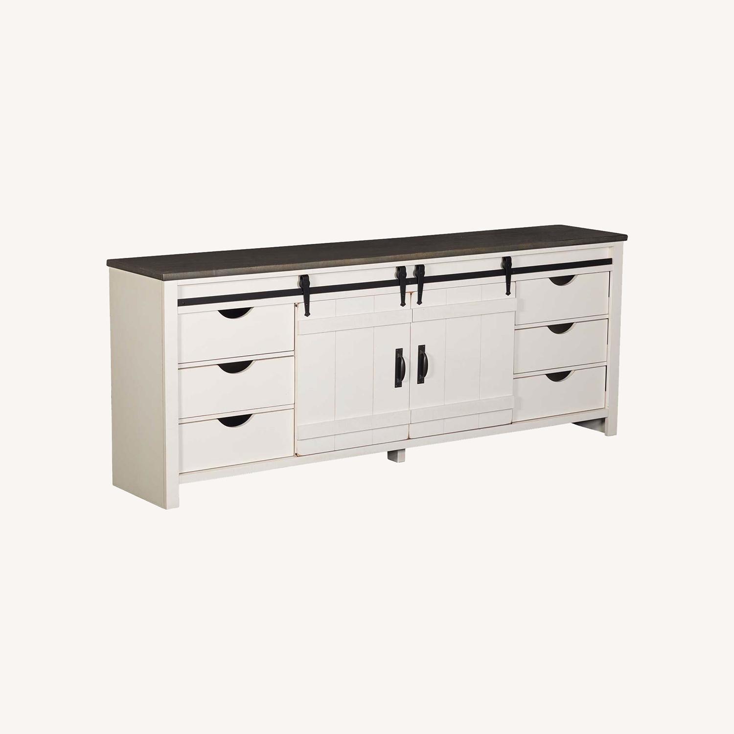 Seller's Notes:Rustic Farmhouse Sliding Barn Door Media Console – White & Dark Wood Finish Upgrade your living room with this stunning farmhouse-style media console, combining rustic charm with modern functionality! Perfect for TVs, entertainment setups, or stylish storage. ✨ Features & Details: ✔ Spacious Storage – Features six drawers, two sliding barn doors, and open shelving for electronics, décor, and media essentials. ✔ Farmhouse Chic Design – White distressed finish with a dark wood top and black metal sliding hardware for a classic rustic look. ✔ Versatile Use – Works as an entertainment center, sideboard, or storage unit in your living room, dining area, or bedroom. ✔ Cable Management – Includes a built-in cutout to keep cords tidy and organized. ✔ Sturdy & Durable – Crafted from high-quality wood with smooth sliding doors and durable metal hardware.