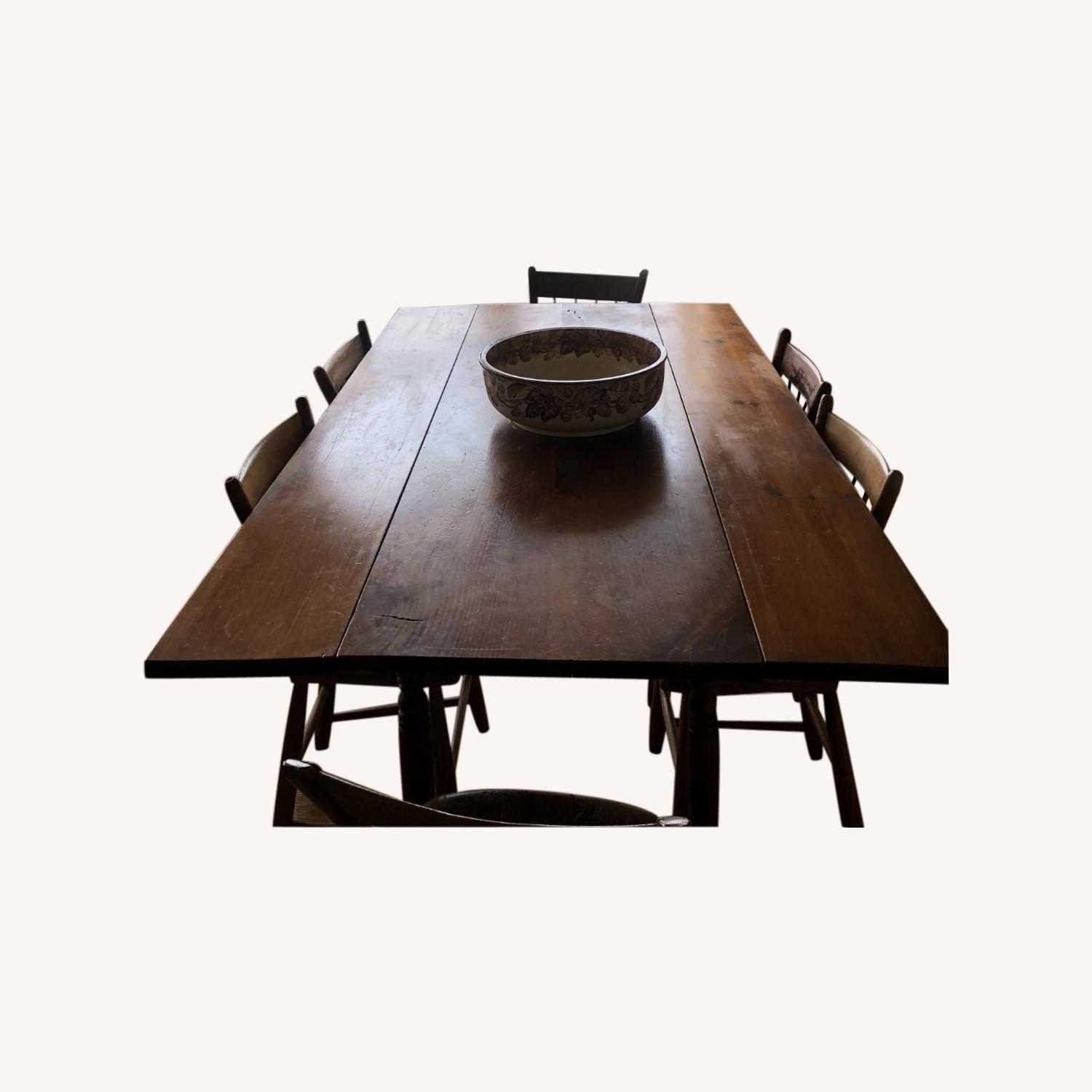 Seller's Notes:Wood farmhouse table with 6 chairs available. Wood has natural cracks but is in good shape. A few of the chairs have bits of paint on them, but this can be taken off.